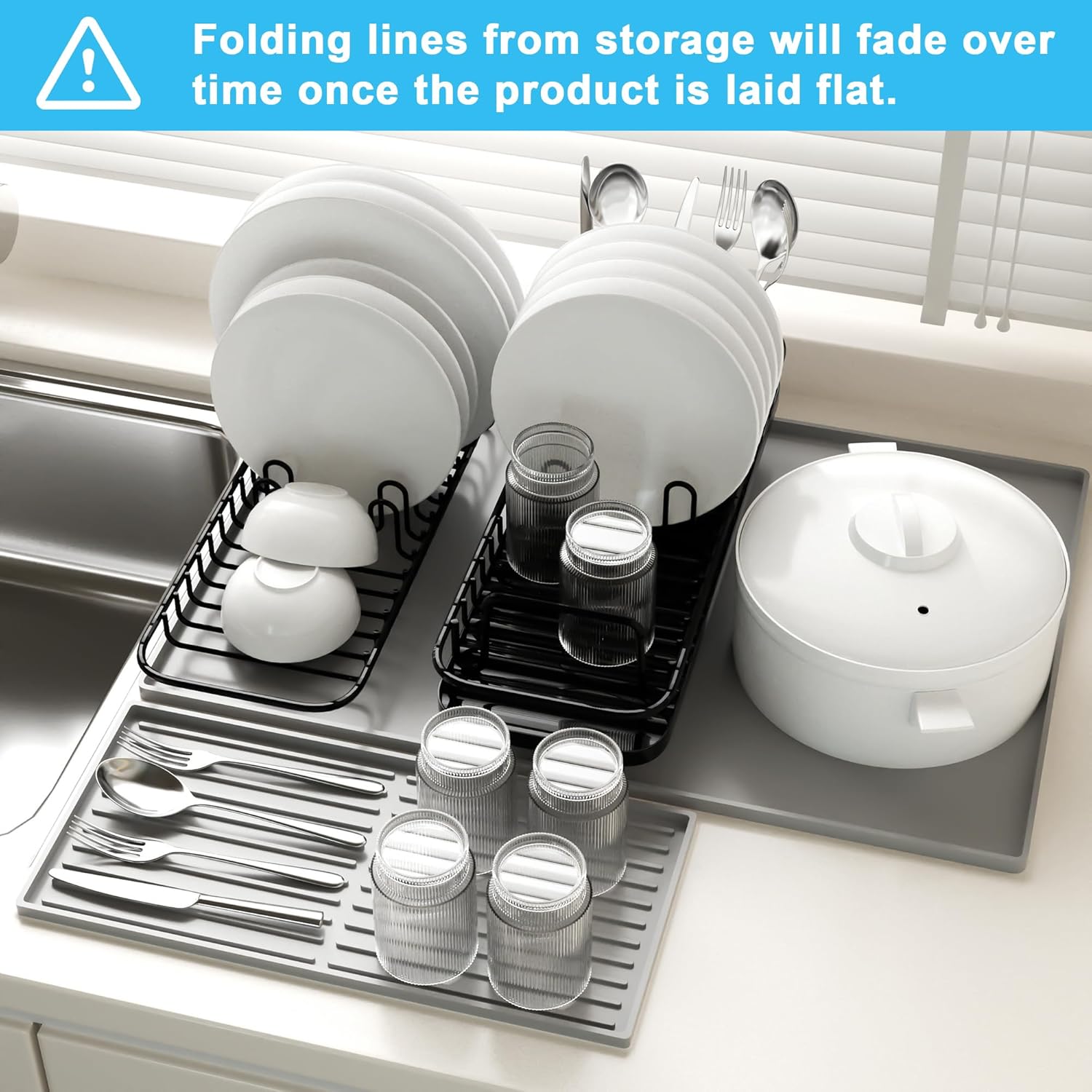 - ๐๐๐๐ข๐๐ข๐๐ง๐ญ ๐๐๐ญ๐๐ซ ๐๐ซ๐๐ข๐ง๐๐ ๐ ๐๐ง๐ ๐๐ฎ๐ข๐๐ค ๐๐ซ๐ฒ๐ข๐ง๐ : Designed with raised edges and a wavy stripe pattern, this silicone mat facilitates optimal air circulation, ensuring fast drying and effective water drainage. It keeps your countertop dry and clean, preventing water spills and stains from dishes, glasses, and kitchenware. It can also be used as a dish drying rack pad, a sink protector for the kitchen sink and an under sink mat.