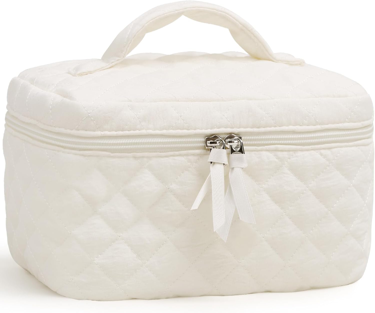 Prite Cotton Makeup Bag Quilted Makeup Bag Large Floral Cosmetic Bag for Women Cute Travel Toiletry Bag with Handle(Beige)