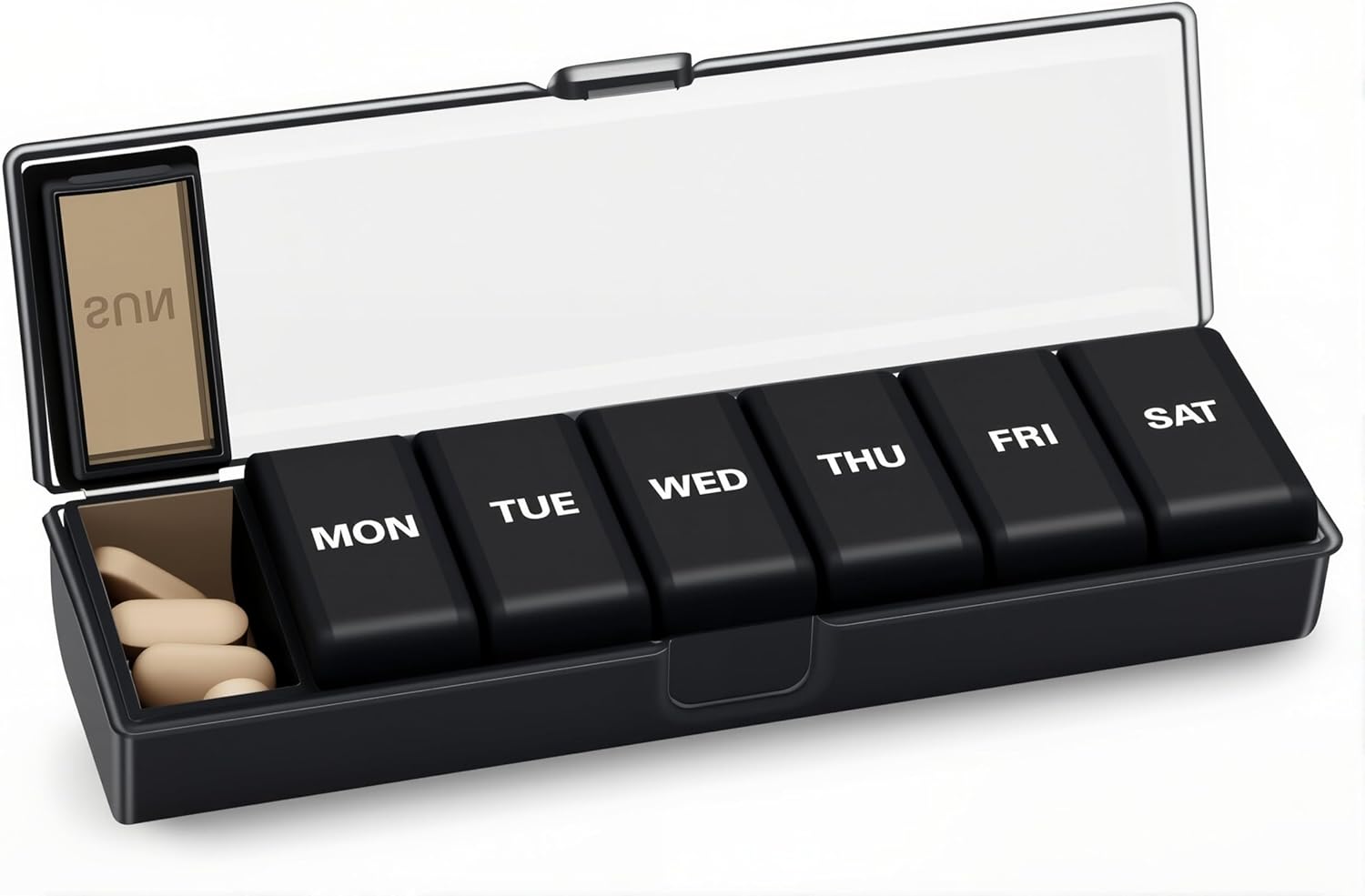 Silicone Weekly Pill Organizer 7 Day, Arthritis-Friendly Medicine Box Daily Pill Box, Large Medicine Case with Shell, Compact Travel Pill Container for Pill, Vitamin, & Fish Oil (Black)