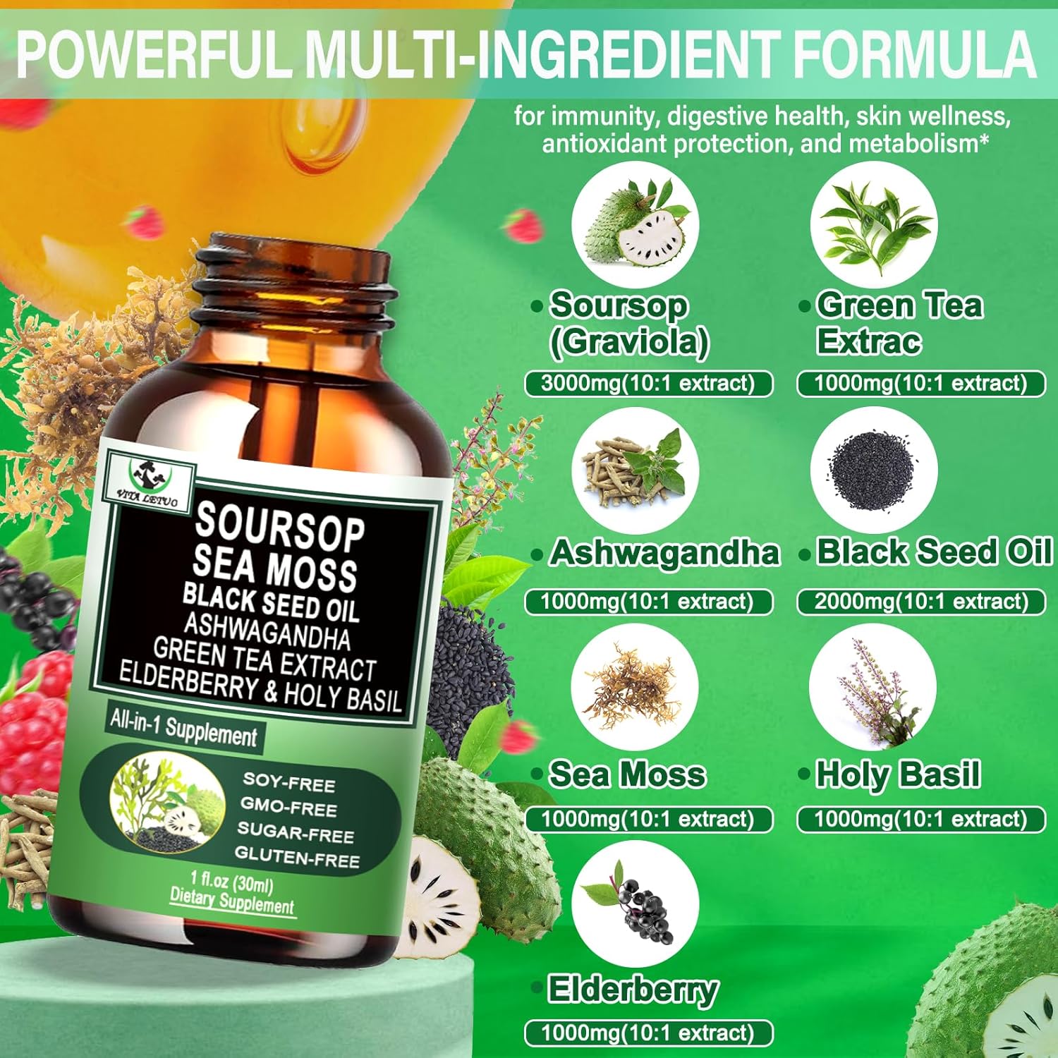 Soursop Drops,Soursop Bitters Liquid with Sea Moss Black Seed Oil Green Tea Extract Ashwagandha Elderberry Holy Basil-Multimineral&Vitamins Superfood Drops for Immune&Digestive & Cell Support