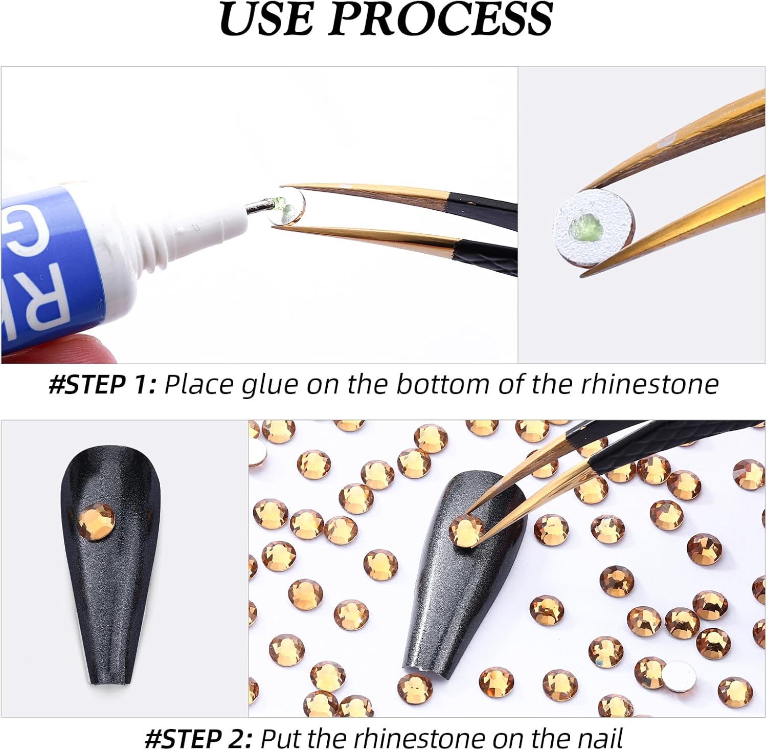 - Use tweezers and Picking Pen gem picker to pick rhinestones, There is no glue on the bottom, additional nail gel is required, or other professional glue for makeup or nails; Can use E6000/E7000 super glue to fix on crafts, art decoration; not hotfix