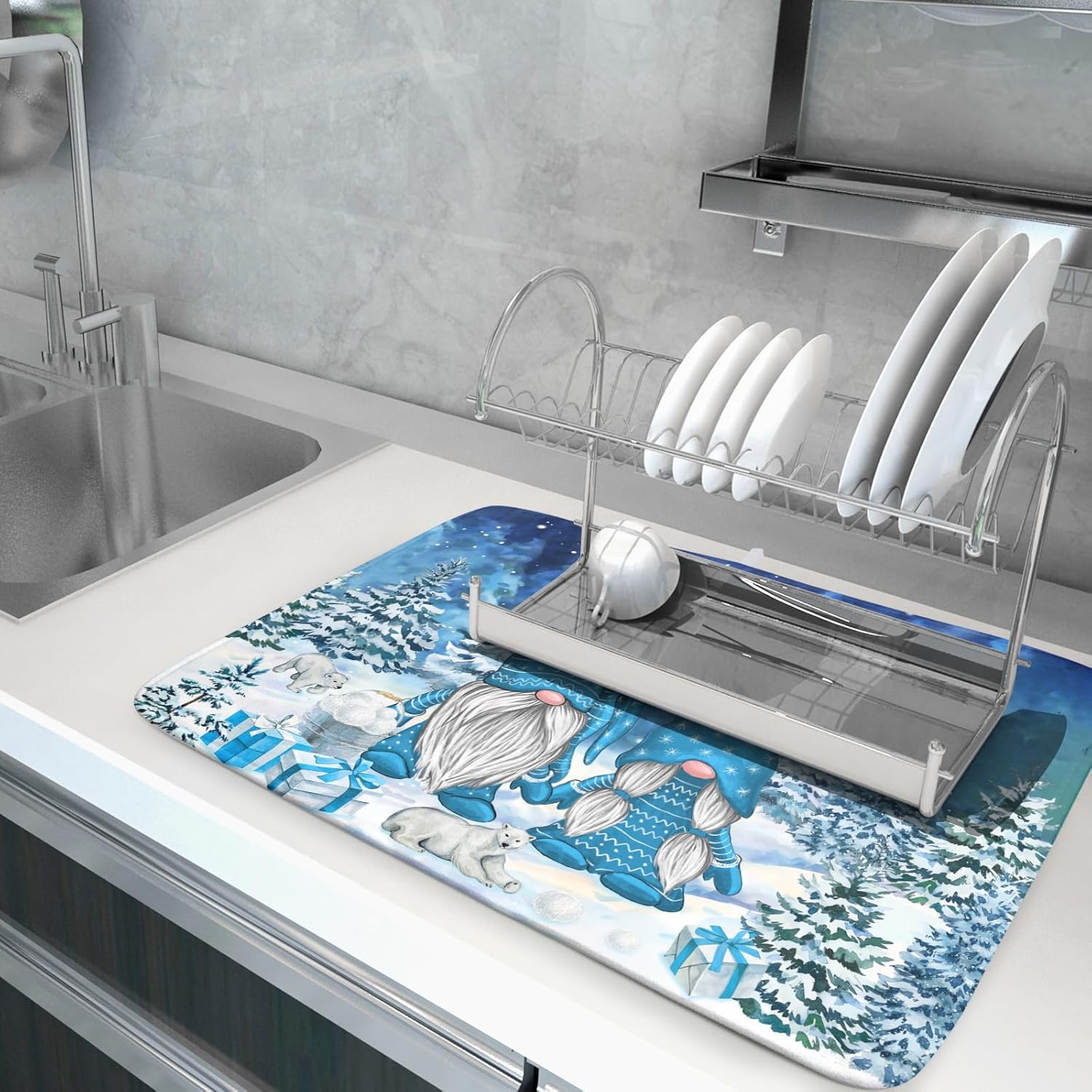 Winter Blue Gnome Dish Drying Mat for Kitchen Counter Pine Tree Microfiber Dish Pad Absorbent Reversible Fast Dry Draining Mats 18x24 Inch