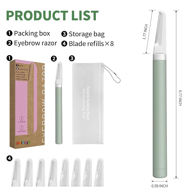 - 【Dermaplaning Razor with Safety Cover】Derloyo’s new and improved exfoliating and dermaplaning tool is everything you need to shape your eyebrows, remove fine facial hairs, and even smoothen your skin. Experience our eye and eyebrow razor designed specifically for women, which removes unwanted hair, exfoliates and gives you a radiant look.