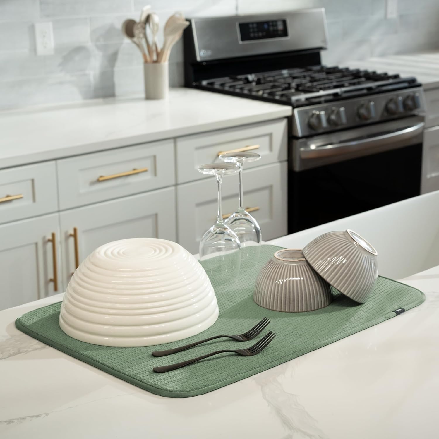 - Catch the kitchen sink drips under a dish drying rack or place your plates, forks, spoons, pots and pans set, or glassware directly on the drying mat