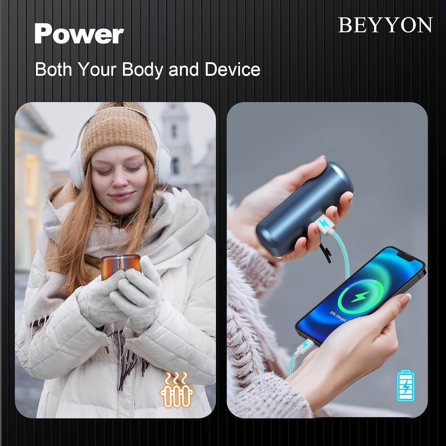 - 【Extended Battery Life, Portable Power Bank】-BEYYON hand warmers come with 10,000mAh high-capacity battery, providing you all day outdoor warmth. Each hand warmer can also function as a portable power bank to charge your phone, earbuds, and other devices. Juice both you and your devices up on the go!