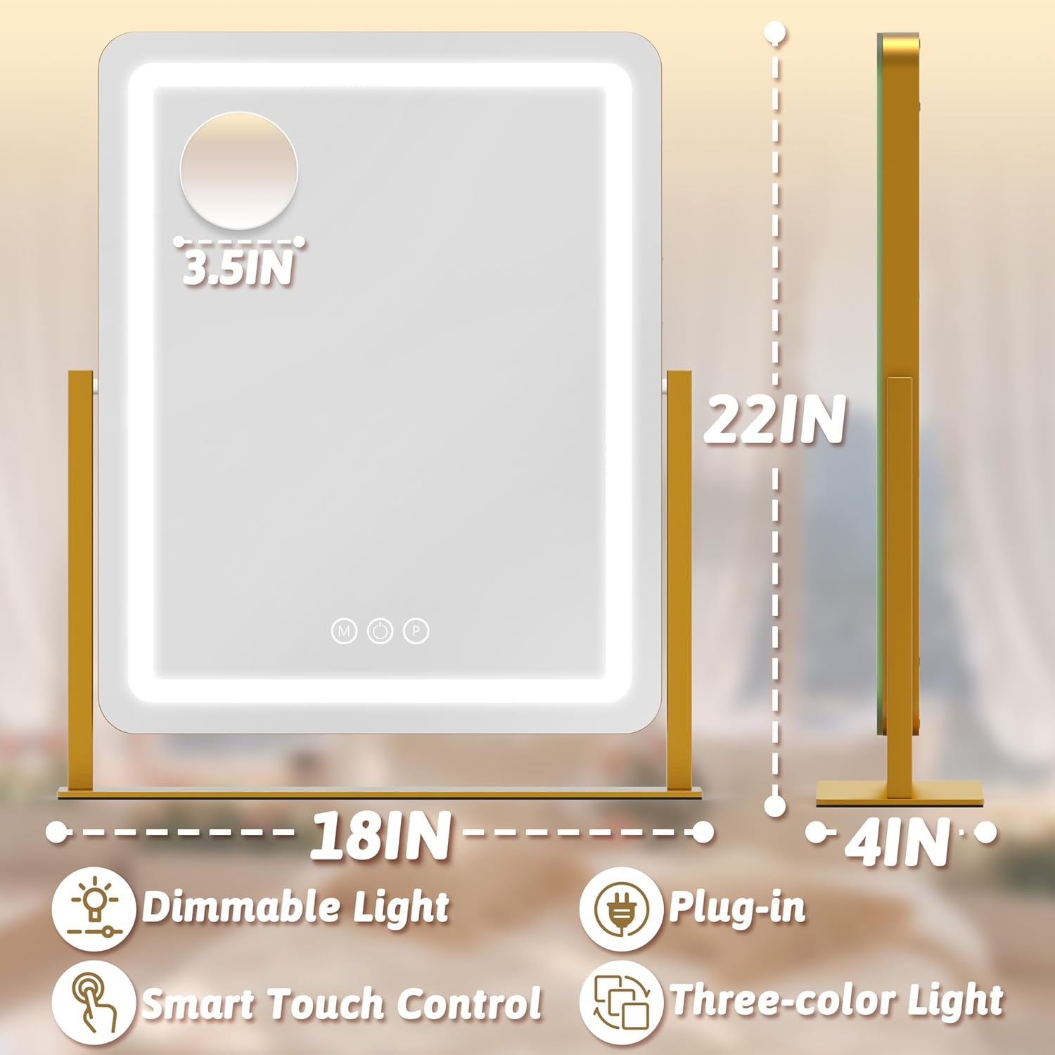 Vanity Mirror with Lights, 18"x22" LED Makeup Mirror with 10X Magnification, Smart Touch 3 Colors Dimmable, Light Up Mirror for Makeup Desk, 360° Rotation, Gold