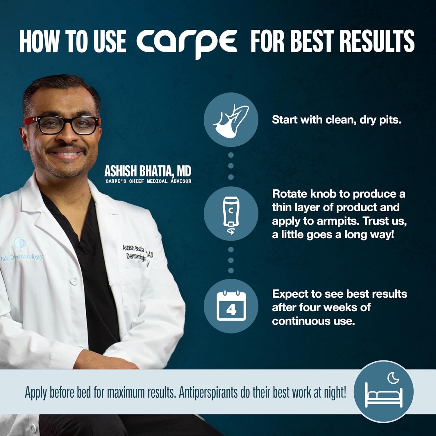 - DEVELOPED WITH DERMATOLOGISTS: Carpe’s scientifically developed sweat control formula has been independently tested for safety and proven to be a leading over-the-counter sweat solution. Our deodorant for extreme sweating is gentle on skin & provides the protection you can count on!