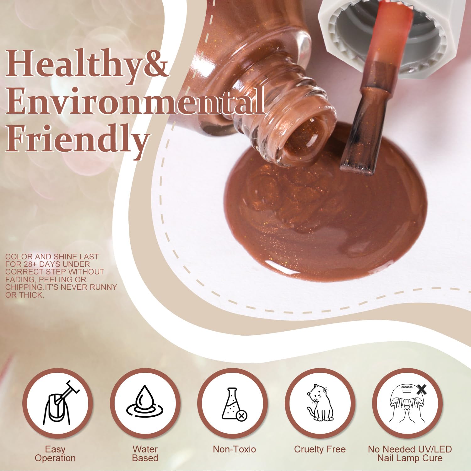 - NOTE: This nail polish is resistant to chipping and peeling, but for a longer-lasting shine, we recommend applying a top coat to keep the gloss for over 15 days!