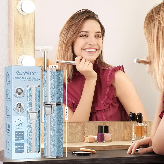 Facial Hair Remover for Face Lip, Electric 2 in 1 Face Shaver and Eyebrow Trimmer, Rechargeable Blue Nose Hair Trimmer for Women with Built-in LED Light