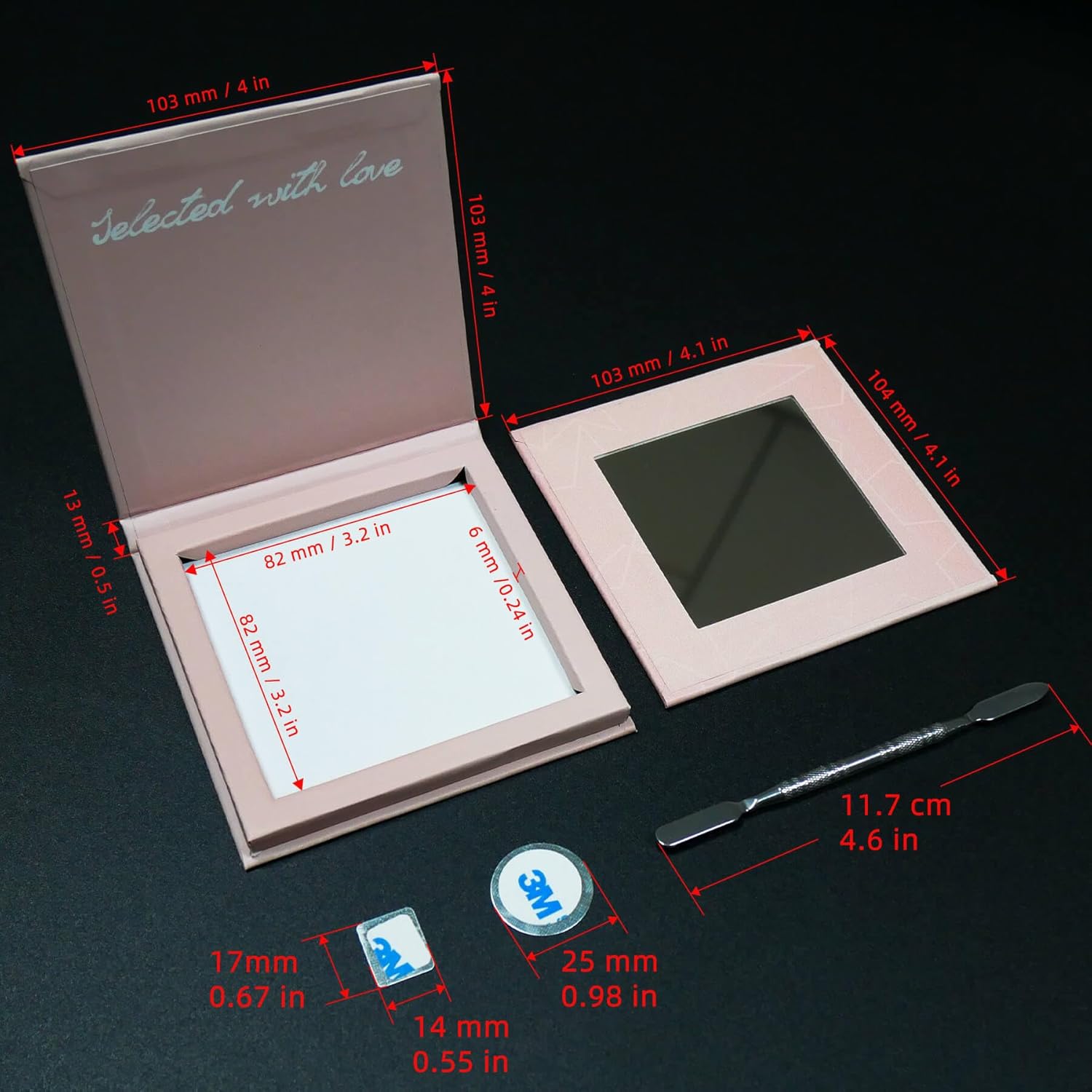 - Magnetic Palette Dimensions: External dimensions : 10.4x10.4x1.5 cm (4.1x4.1x0.6 in); internal dimensions: 8.2x8.2x0.7 cm (3.2x3.2x0.28 inches). Fits approximately 9 to 12 1-inch eyeshadow pans, depending on layout