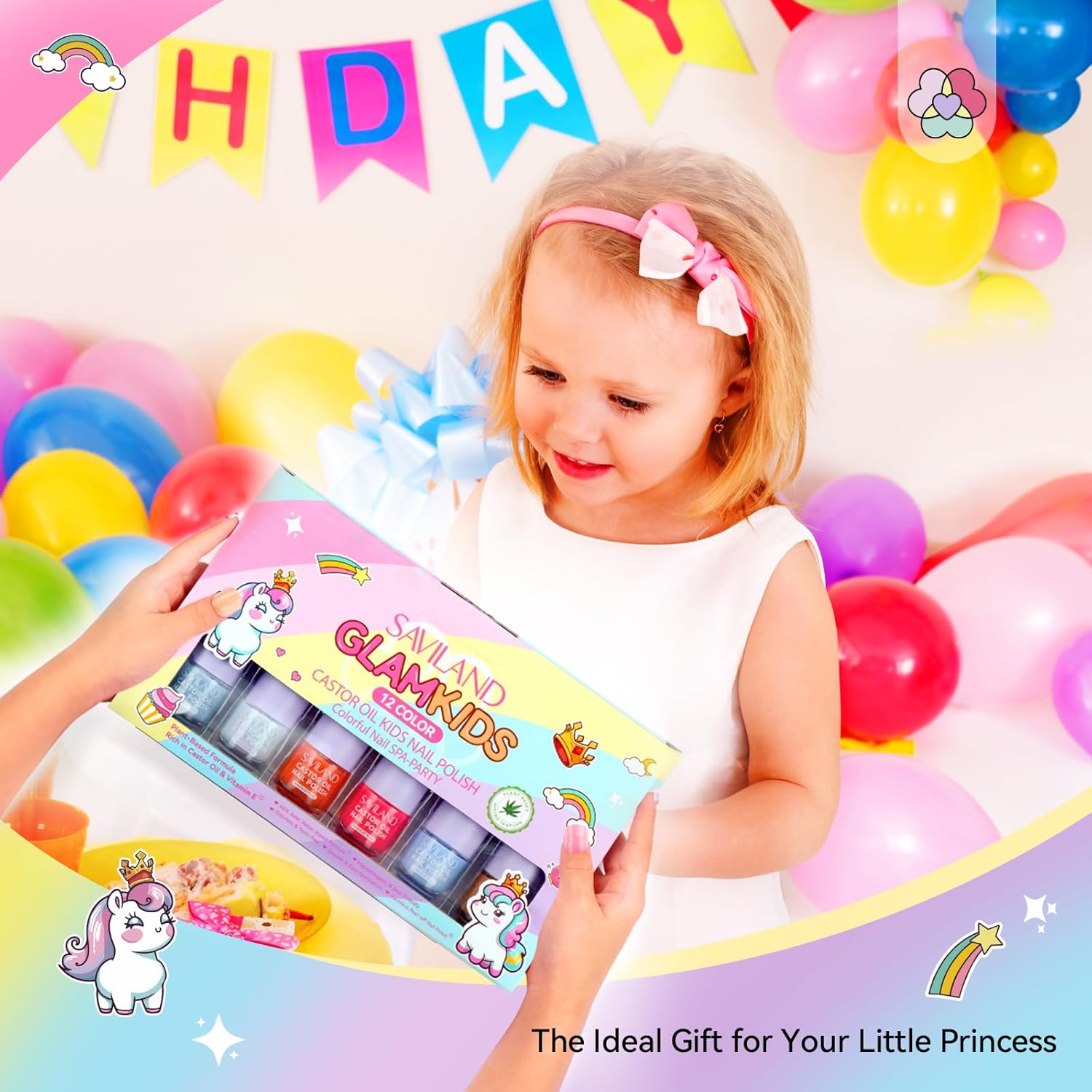 SAVILAND Glamkids Kids Nail Polish Quick-Dry:Non-Toxic Nail Polish Set 12 Colors Water Based Peel-Off Toddler Fingernail Polish Natural Safe Castor Oil Nail Lacquer Kit with Sticker for Girl Ages 5-12
