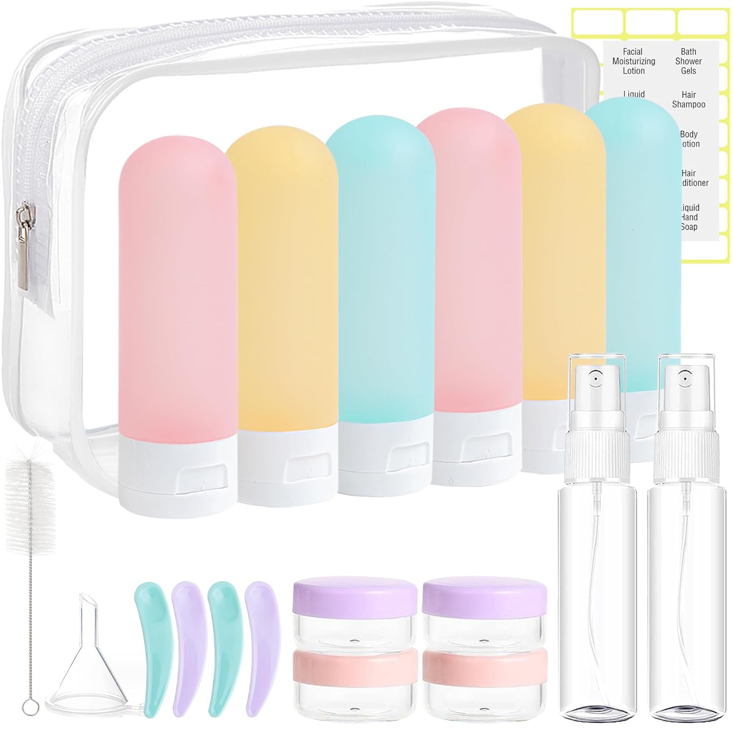 - Travel Accessories Must Haves: This useful travel container set meets the needs of on-the-go travel essentials, which includes 6 travel bottles(60ml/2oz), 4 travel jars(10ml/0.3oz), 2 spray bottles(30ml/1oz), 4 spoons, 1 funnel, 1 cleaning brush, and 2 types of labels, as well as 1 transparent makeup bag. Variety of travel containers allow you to take along different beauty products, cosmetics and toiletries according to your needs.