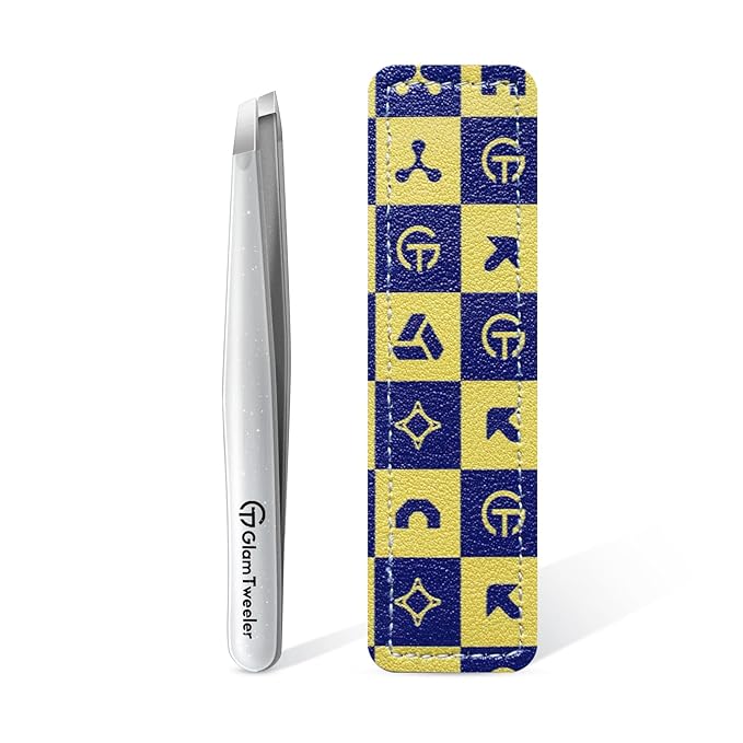 Expert Slant Tip Tweezers with Leather Case, GlamTweeler Sharp & Precision Stainless Steel Tweezer for Eyebrows, Facial Hair and Fine Hairs Removal (Sparkle Silver)