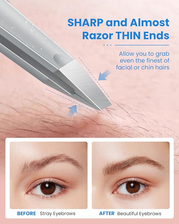 - 【Sharp SLANT TIPS for Every Hair】25° slanted tip is the perfect angle for removing unwanted hair. These ultra-fine tips grip the tiniest hairs effortlessly - from peach fuzz to stubborn chin hairs. Unlike flimsy tweezers, our professional-grade design removes hairs cleanly without breakage. Perfect for women's facial hair care routines and men's grooming kits alike.