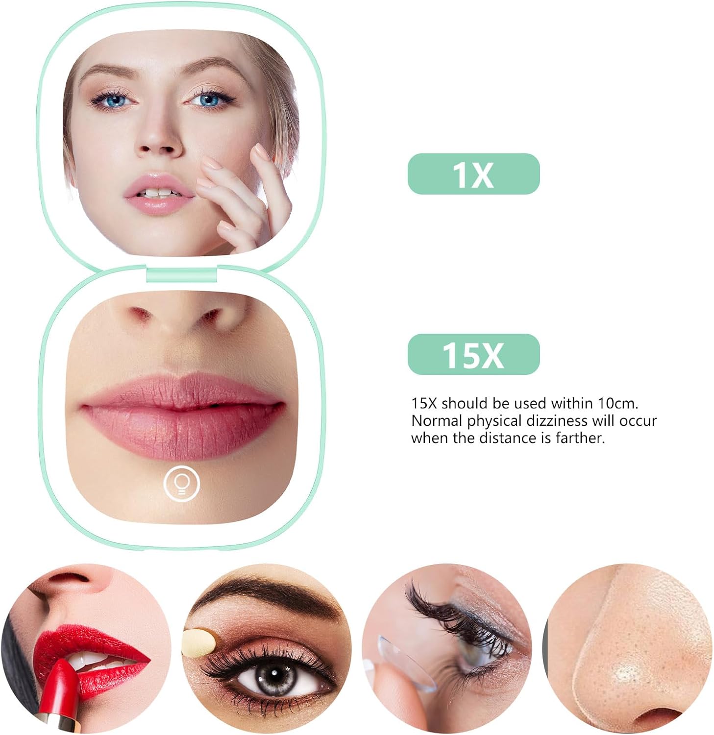 Portable Compact Mirror with Lights,15X Magnifying Pocket Mirror for Purse, Dual LED Travel Mirror with 3 Color Modes, Auto Shut-Off, Small Mirror Compact, Perfect Makeup Travel Essential