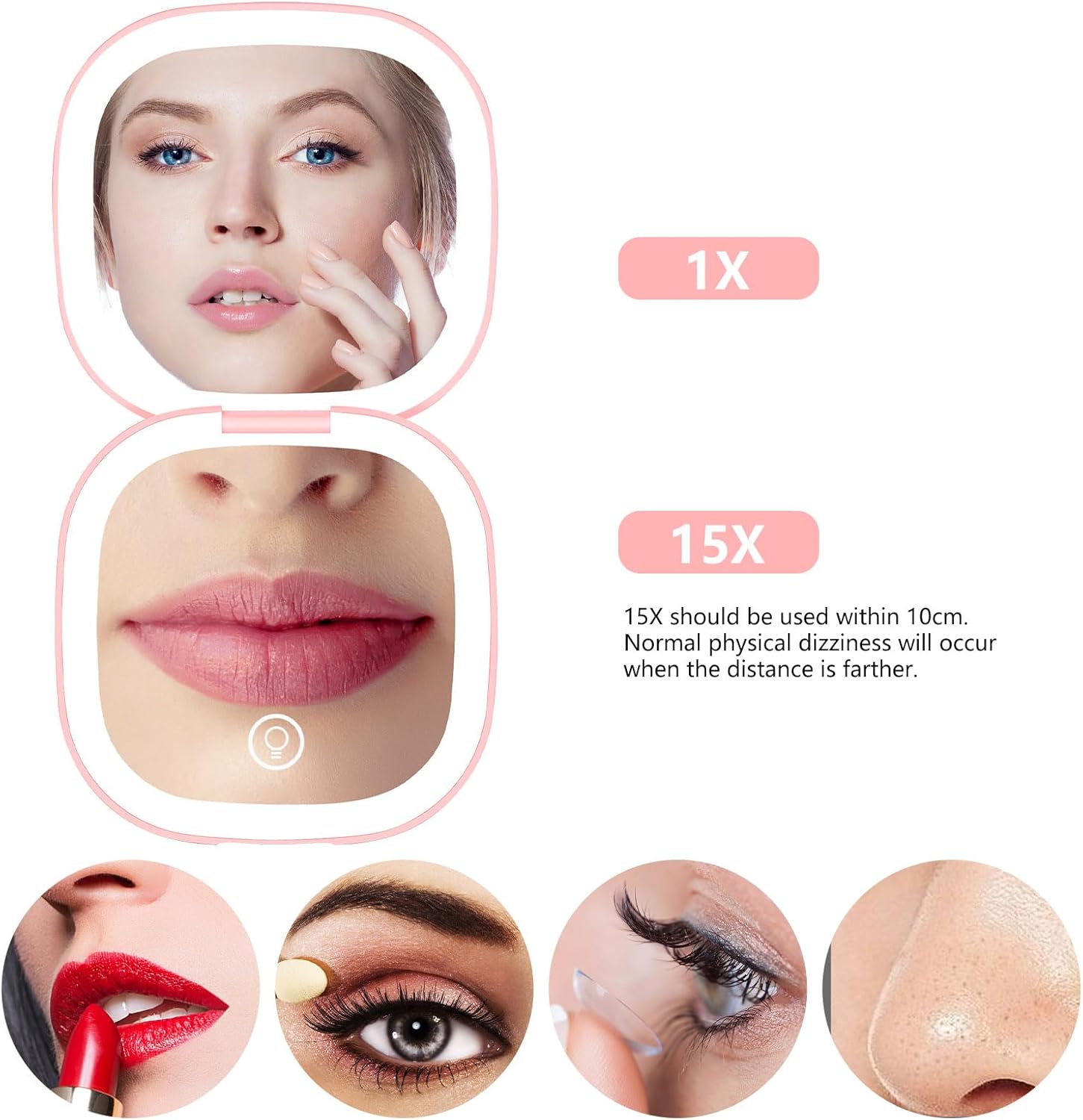 Travel Magnifying Mirror with Light,Dual-Sided Compact Mirror for Purse with 15X Magnification, 3 Lighting Modes, Auto Shut-Off, Portable Pocket Makeup Mirror, Essential Travel Mirror