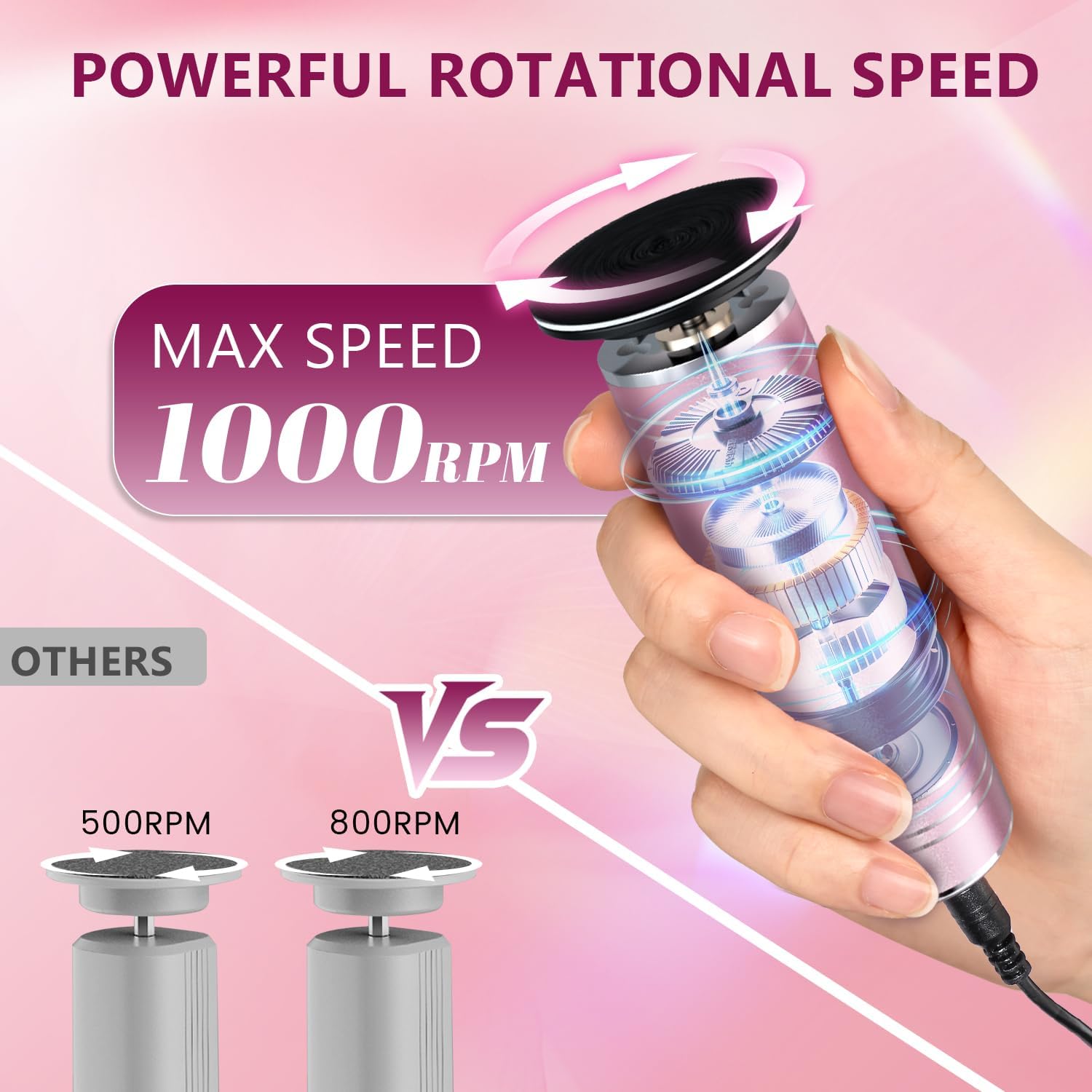 - 【ADJUSTABLE SPEED】:Upgrade electric callus remover has adjustable speeds (0-1000 rpm), if the dead skin on your feet is thicker,you to use the upgraded version for better results!The foot grinder can also change the direction forwards and backwards, it can rotate 360 degrees.bringing you a portable and free using callus removal experience