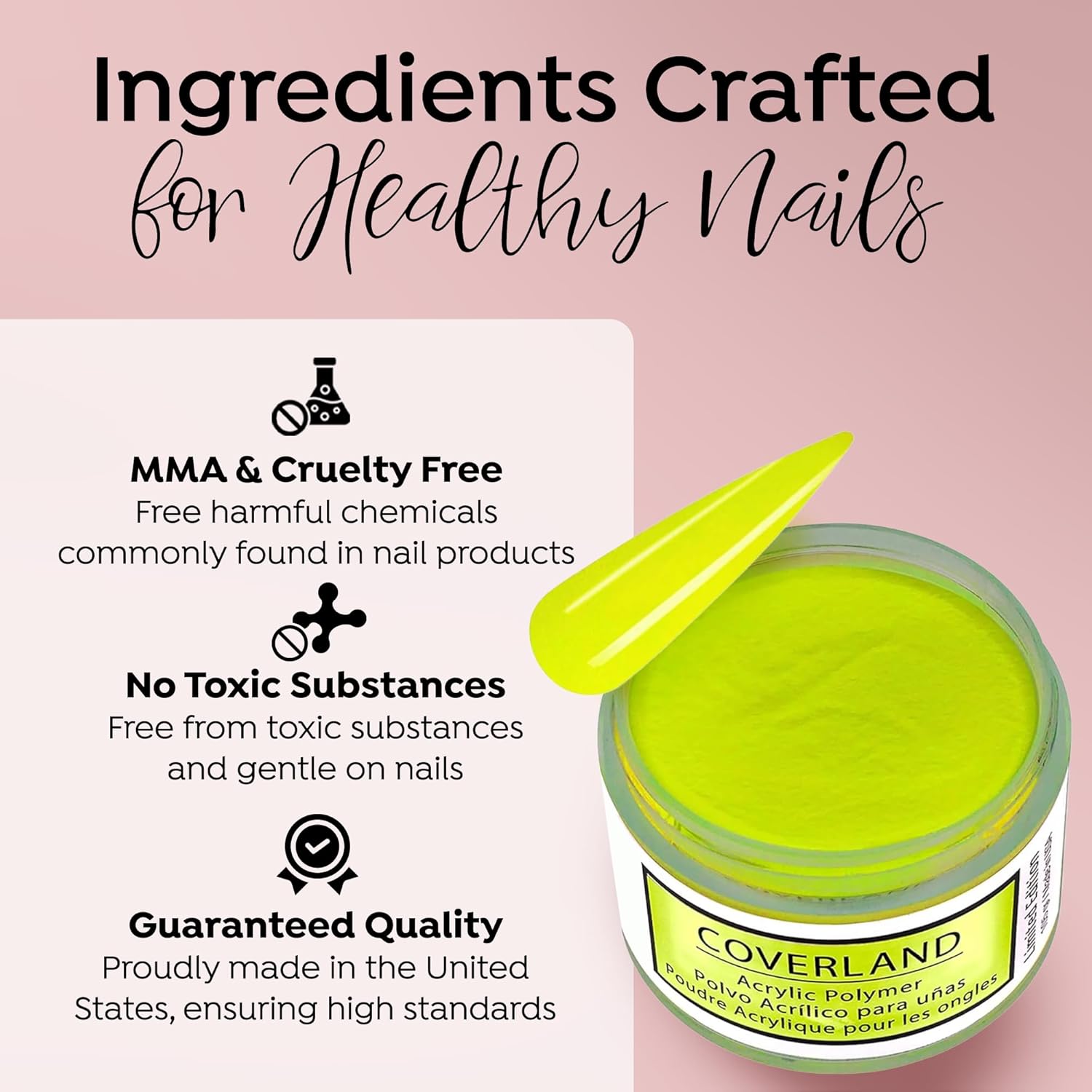 - PROFESSIONAL GRADE: The flexibility and adhesion properties of Coverland colored acrylic nail powder make it easy to shape nails with precision, and offers nice control for professionals who prefer to work with a polymerization rate of moderate to fast.