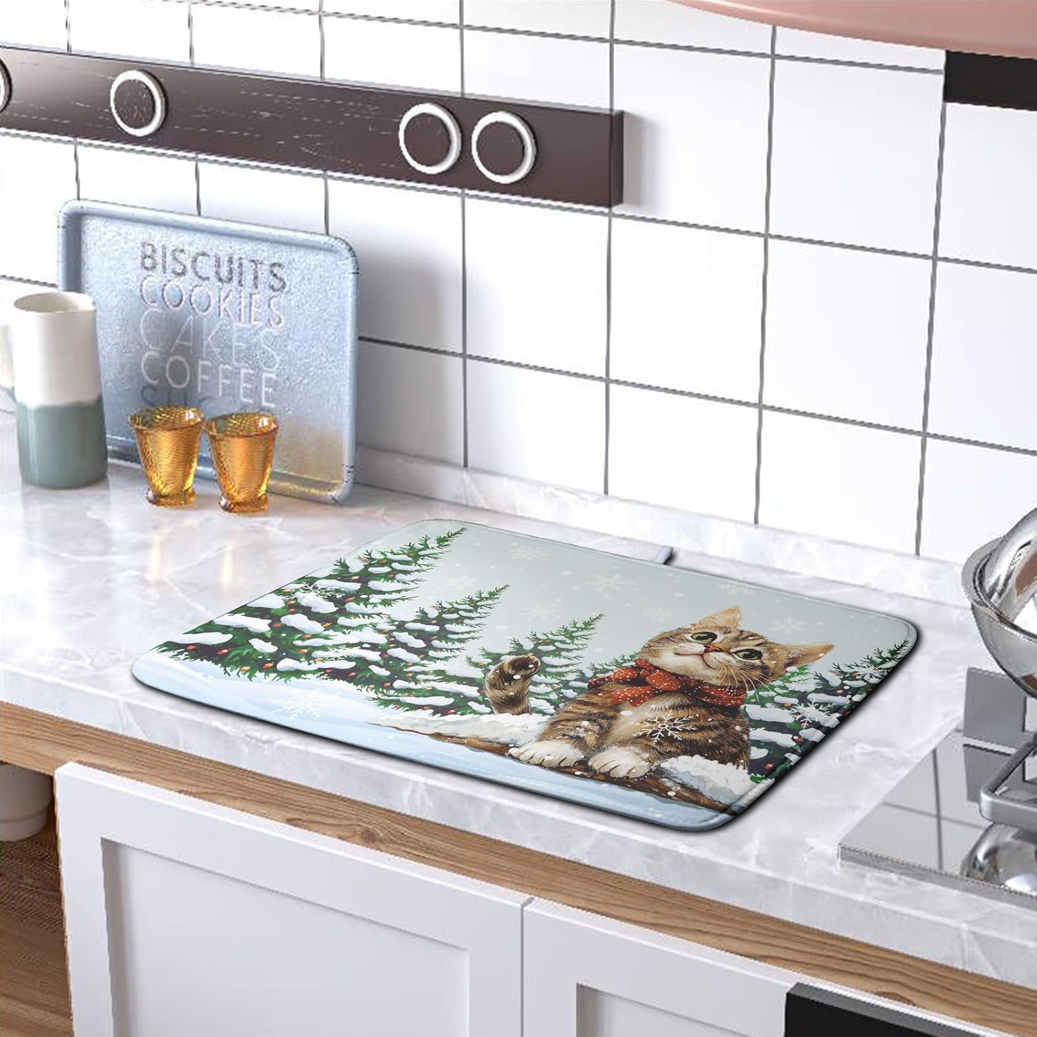 - Perfect Dimension: The winter pine tree drying mat for kitchen counter size 16x18 inch, fits most counters. The kitten dish mat is soft pliable material easily rolls or folds up for storage, simply fold up and toss in a drawer or tuck it elsewhere when not in use, does not take up space.