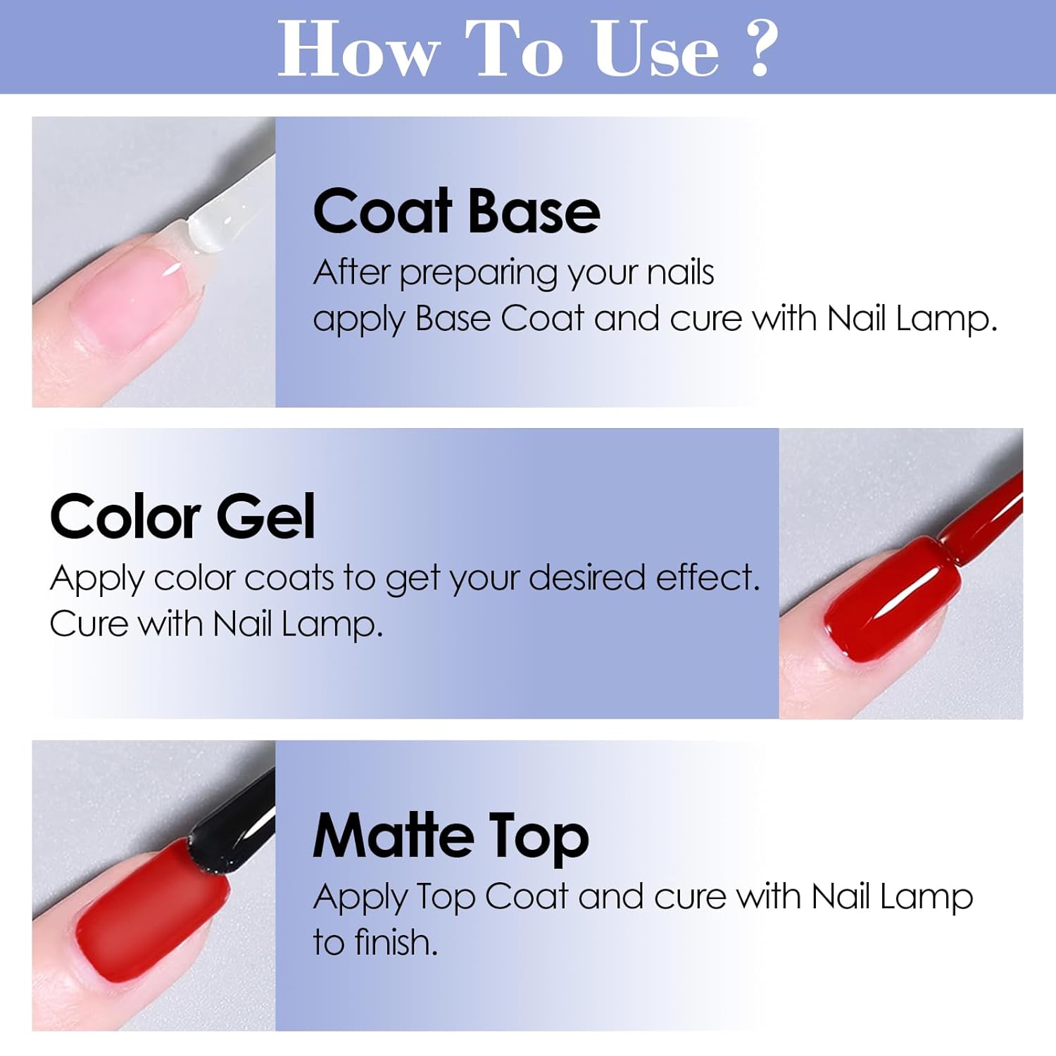 - Nail Lamp Required:The matte gel top coat requires to be cured under the uv or led nail lamp for 120s, Apply a thin layer; it is not recommended to apply it too thickly, as you may feel a slight curing heat. You can control the curing by frequently pressing the button on the phototherapy lamp for a strobe effect.