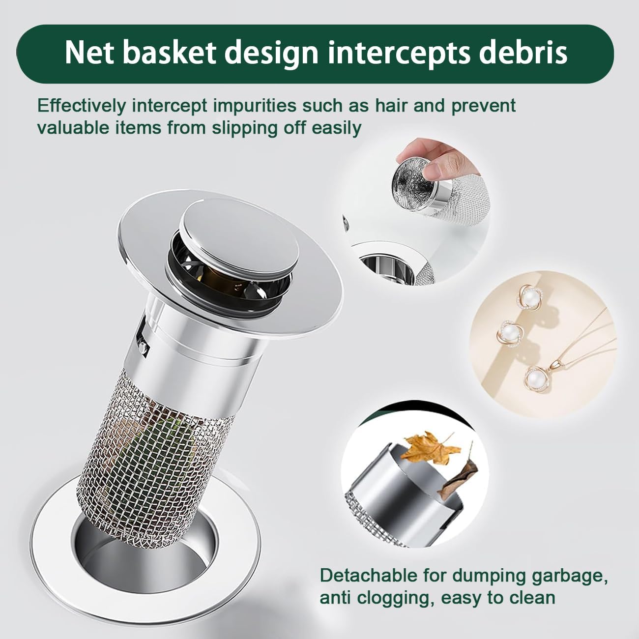 - Upgraded 2-in-1 Function: The pop-up bathroom sink drain strainer features an anti-clogging basket inside, combining the sink pop-up stopper and sink filterr into one. This design collects hairs and prevents the drain from clogging, or prevents valuables such as rings that are prone to slipping from falling into the sewer. This helps to maintain efficient drainage and prevents clogging issues.