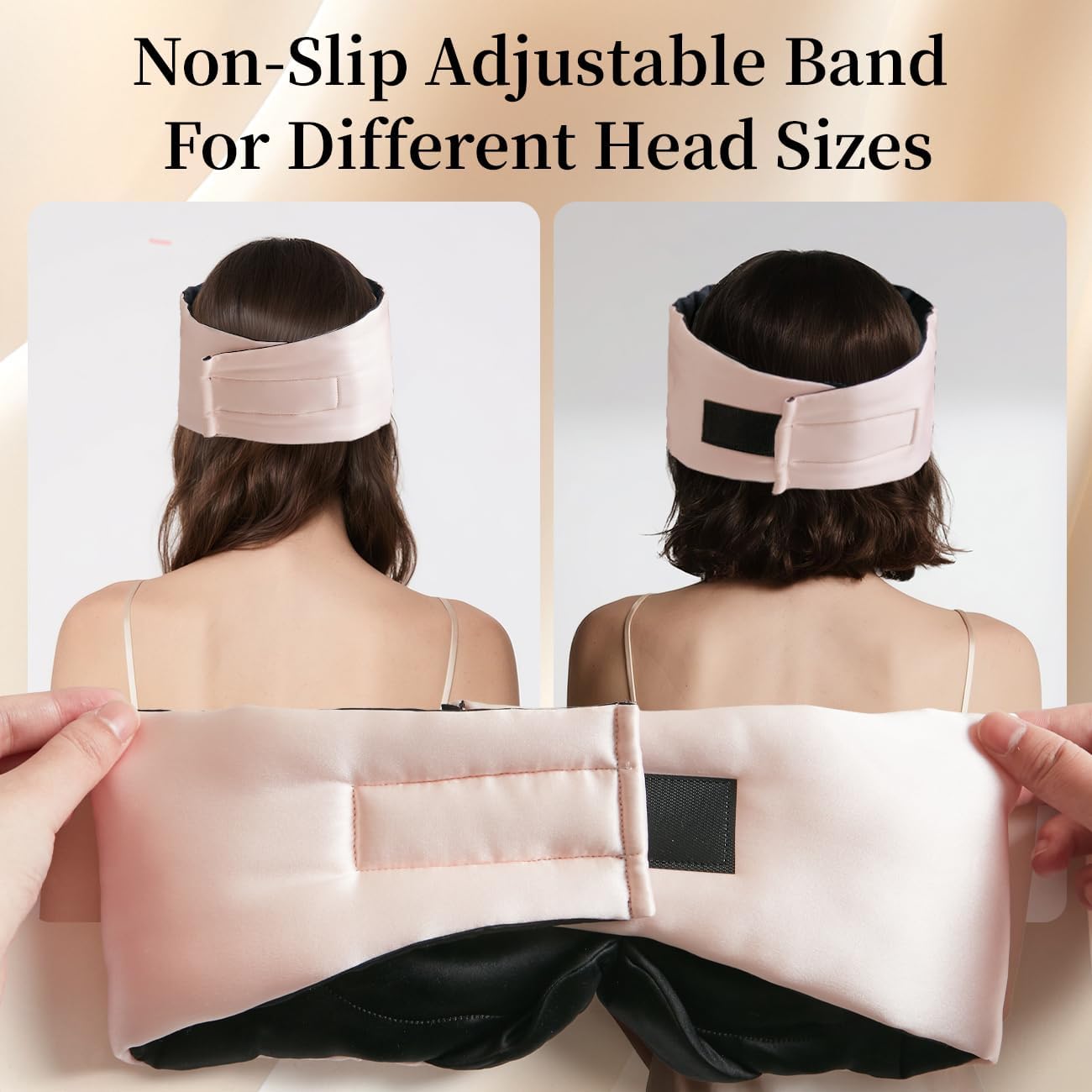 - NON-SLIP ADJUSTABLE BAND FOR DIFFERENT HEAD SIZES: The silk sleep mask features Hook&Loop, which allows us to adjust the size of the sleep masks for women according to personal needs. This flexible design ensures that the silk eye mask stays in place whatever you are side sleepers or back sleepers and the sleep mask will not easily slip off the face.