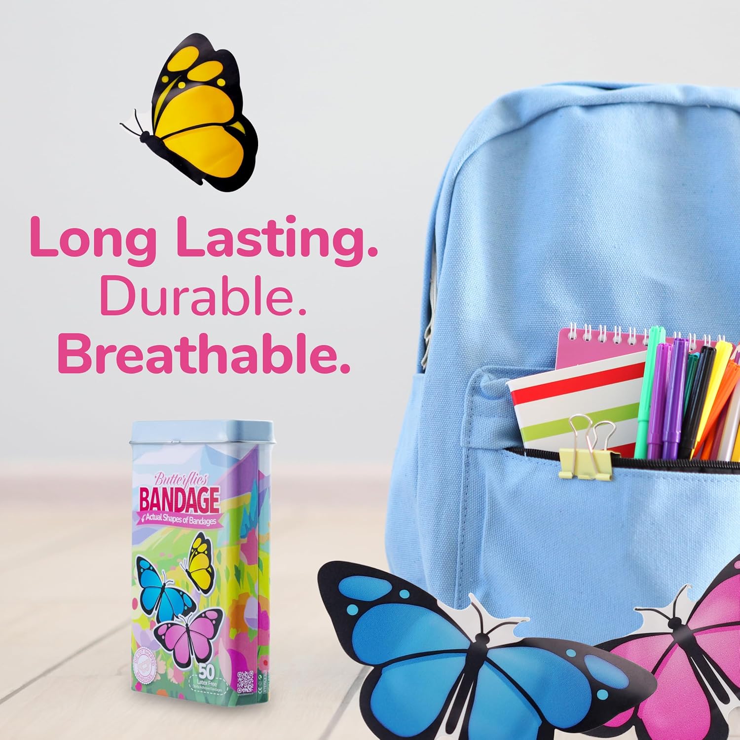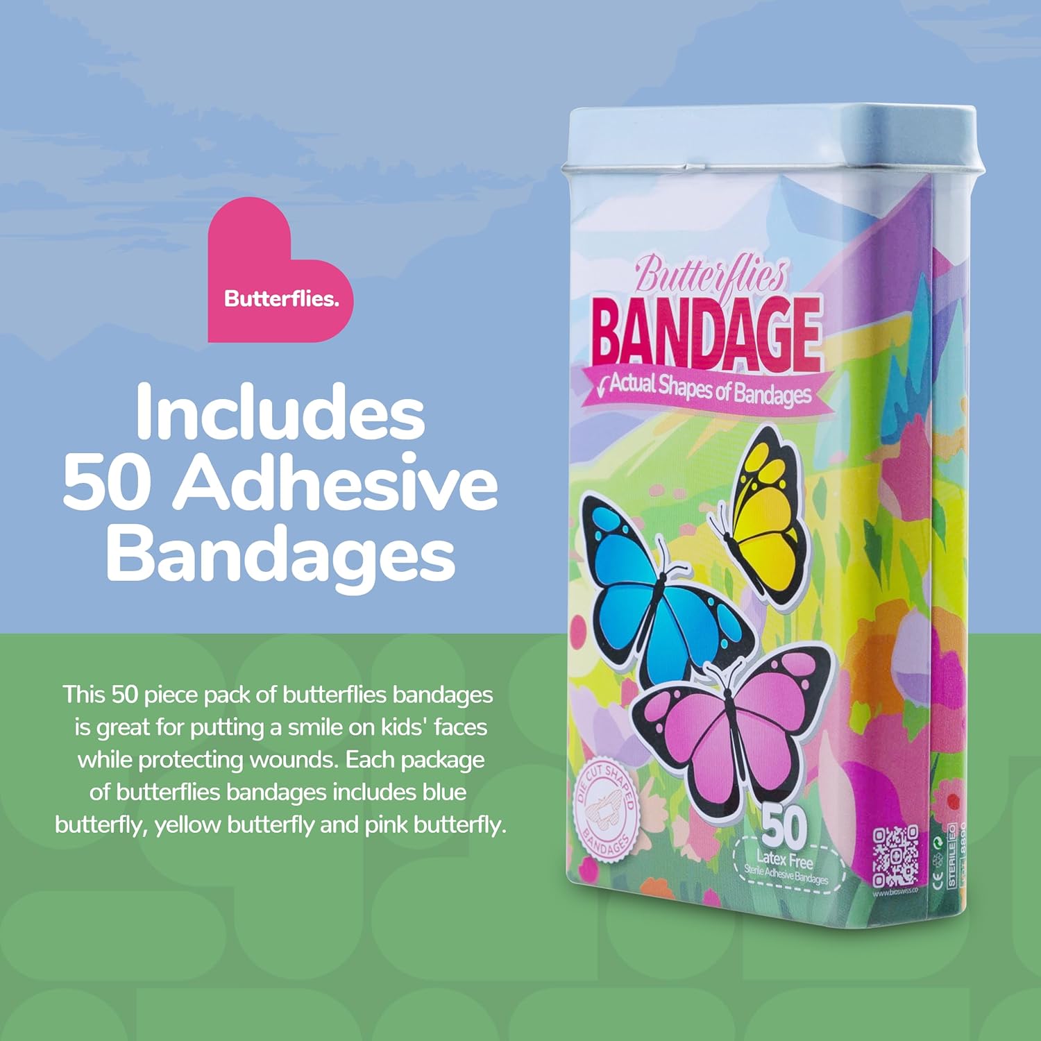 - 50 BUTTERFLY KIDS BANDAGES: Fun butterfly-shaped adhesive bandages tin helps protect cuts, scrapes, and minor wounds while making healing less stressful for children; bandages come in 3 assorted styles