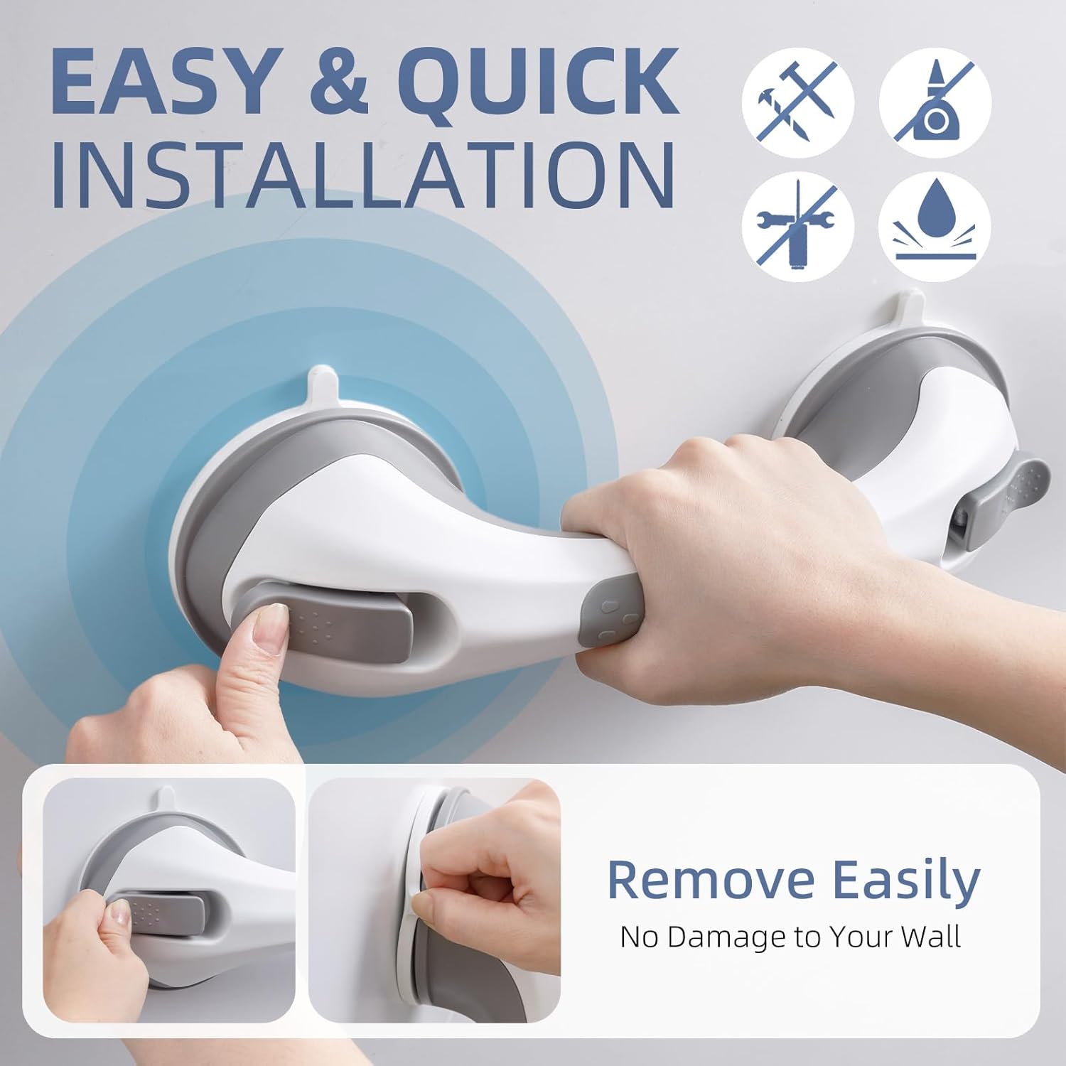 - No Drilling & Easy Installation and Remove: The grab bars only takes 5 seconds to install, even the elderly can easily complete the installation.With no drilling and no hardware,you can install this grip shower handle on your bathroom easily. The safety handles can be removed without damage to the wall. The shower bars for elderly suction can be used repeatedly after dismantling and washing