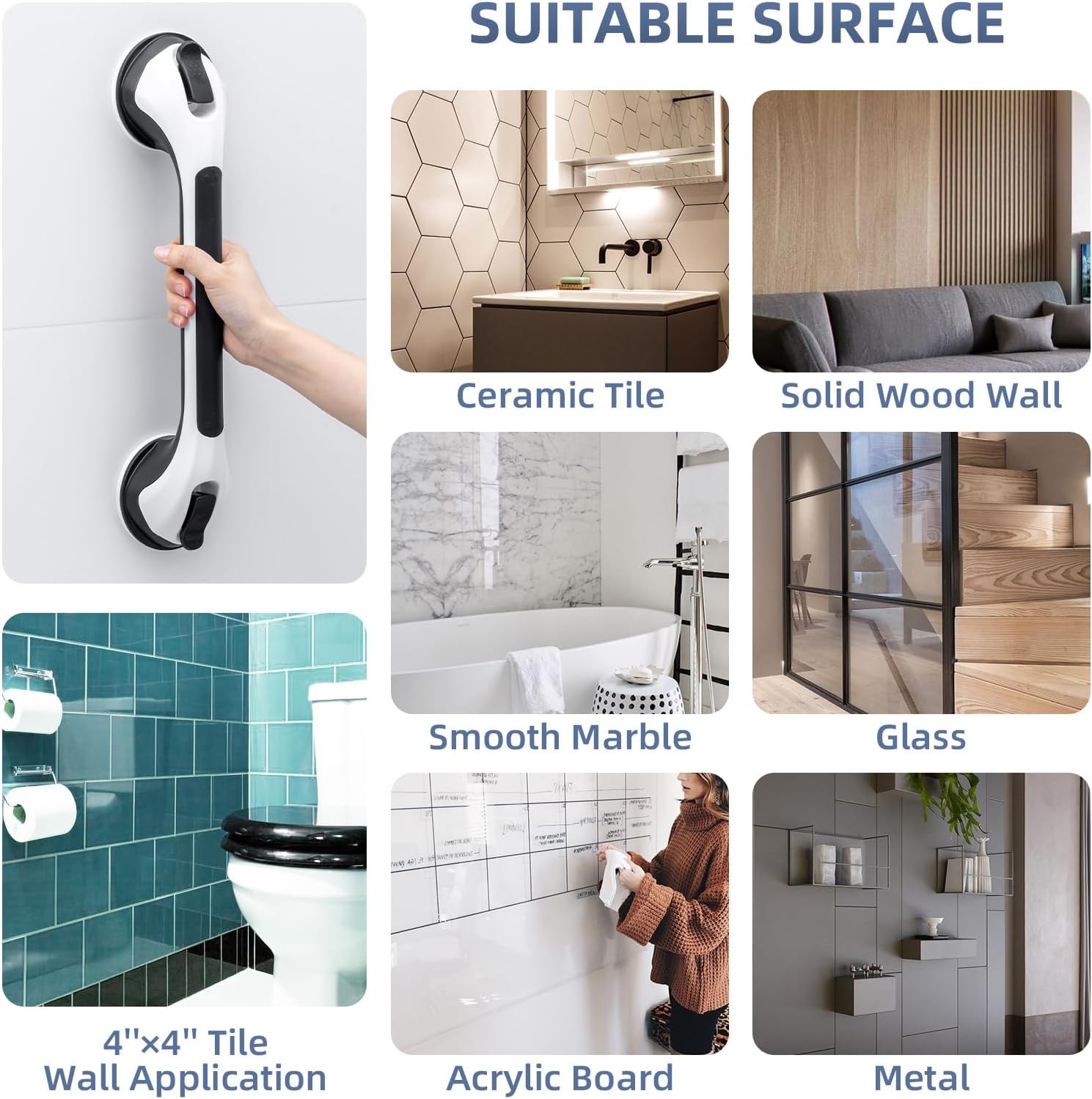 - Warm Tips: Please install this suction grip handle in place and whether it is firm enough before using, pay attention that the suction grab bars for shower ONLY sticks on the impervious and smooth surface, such as Glass, Ceramic Tile, Smooth Marble, Solid Wood Wall, Acrylic Board ect. To make it glow, simply place the shower handle in direct sunlight or under a bright light source during the day. DO NOT install this suction cup grab bar on the crack surface or the porous surface. Please don't put all the body on the shower grip