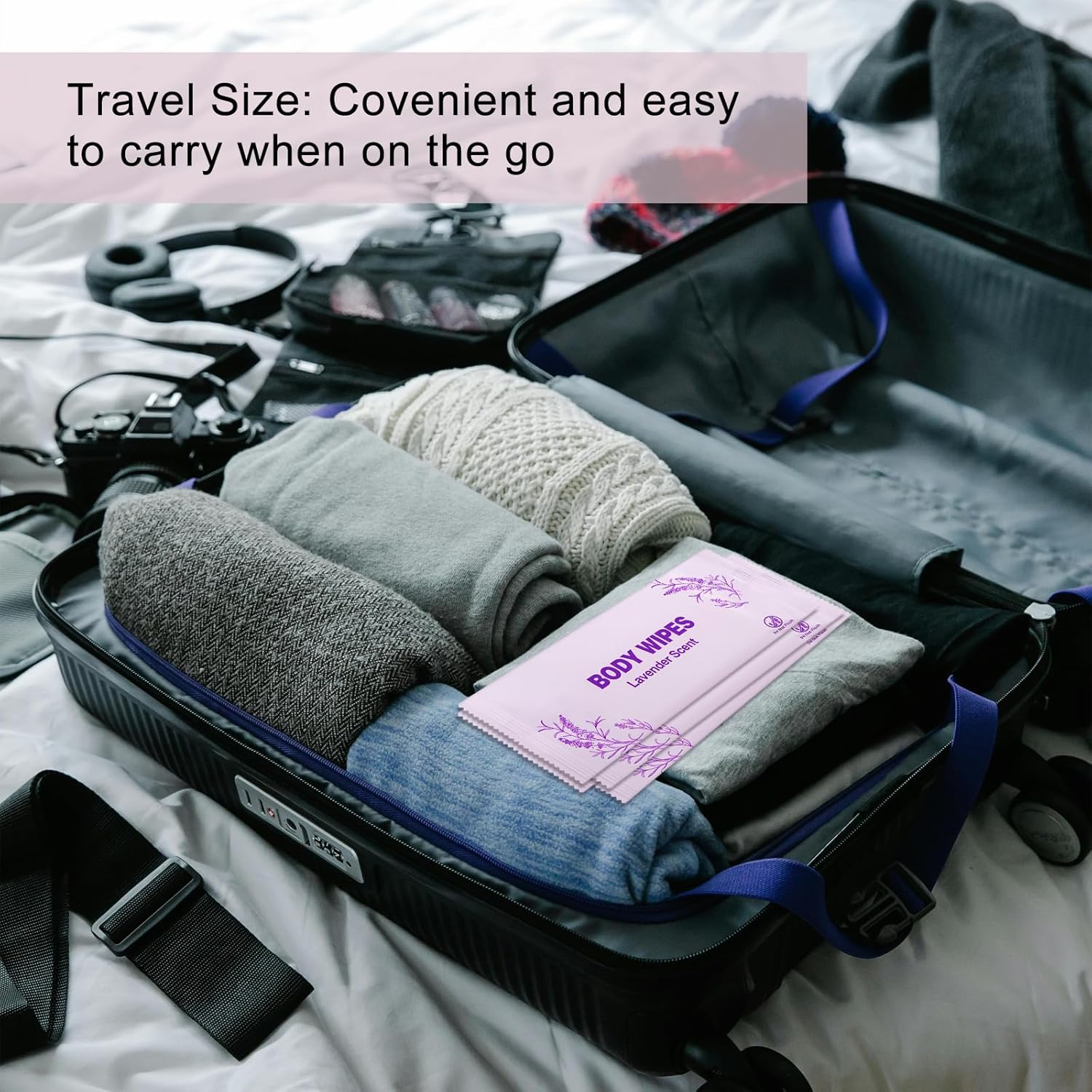 - GENTLE INGREDIENTS: Body wipes travel size are alcohol free, enriched with lavender and aloe essence, gently remove odor without leaving sticky residue, refresh you with a mild and pleasant scent, safe for sensitive skin and daily use