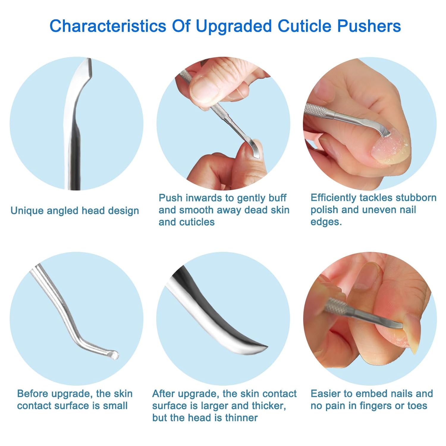 - Upgraded Cuticle Pusher: The upgraded cuticle pusher integrates pushing and cutting functions into one. With a flat-head design, the outer bevel is used for pushing cuticles, while the inner blade is for cutting them