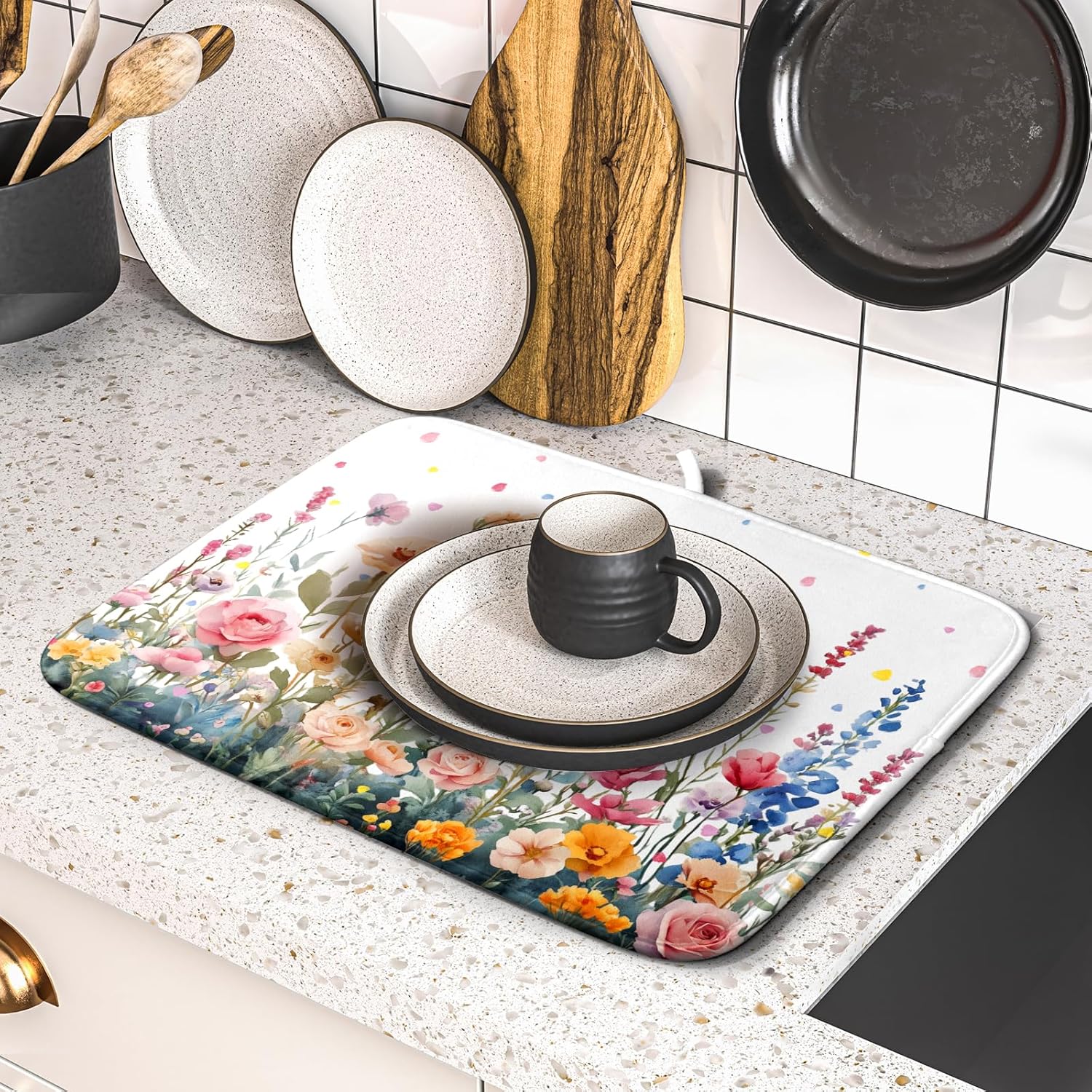 Colorful Flower Dish Drying Mat 16x18 Inch Botanical Floral Drainer Rack Mats Washable Absorbent Dish Dry Pad for Kitchen Counter Sink
