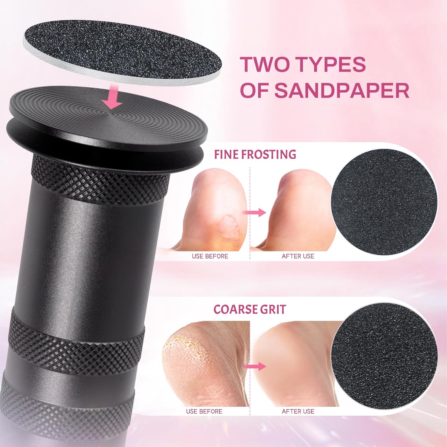 - [60PCS SANDPAPER DISCS]:Foot sander for dead skin womens say goodbye to rough feet with the included 60pcs replaceable sandpaper.Electric foot file for women easy to apply and remove ,interchangeable coarse and fine sanding sheets offers increased personalized care,efficiency,ensuring our feet stay beautifully smooth