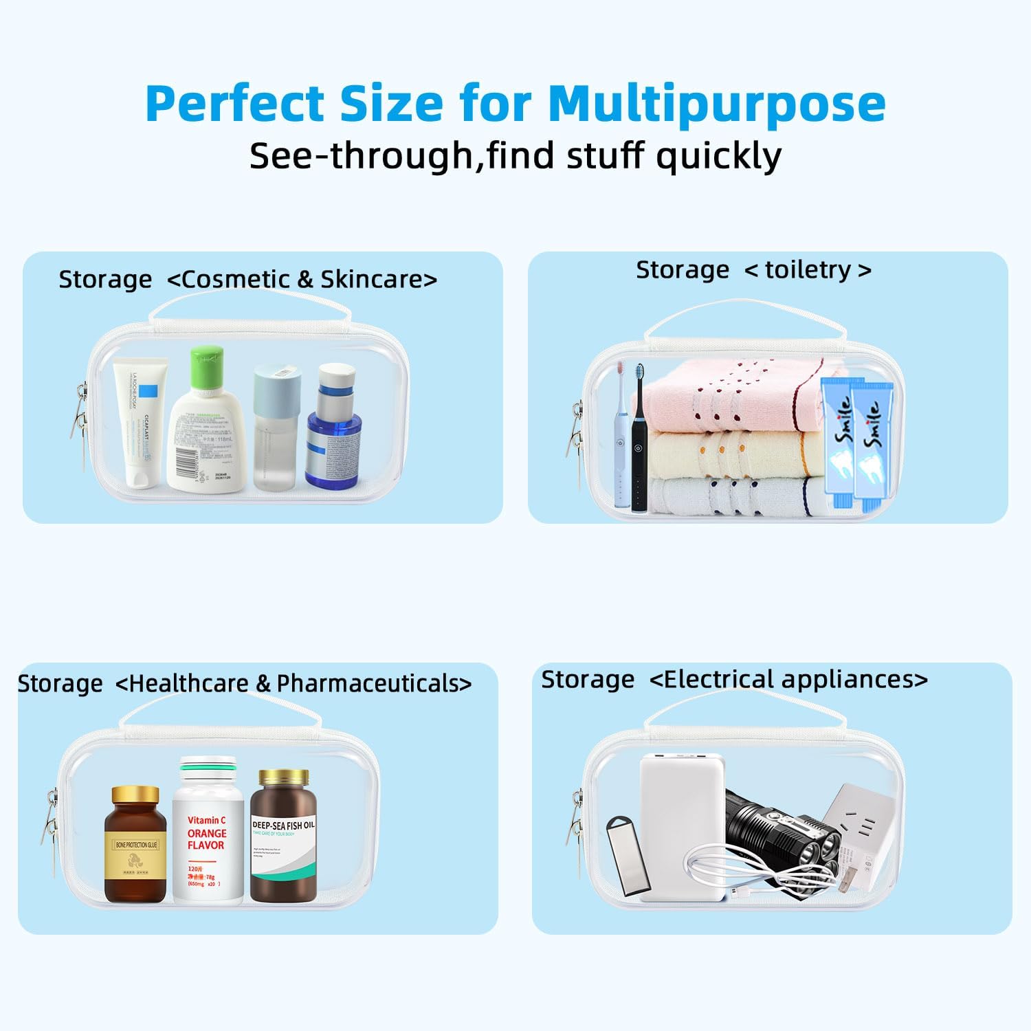 - Stackable & Large Capacity:Stackable Large Capacity Clear Storage Bin, offering a large storage capacity, Size: 7x4x2in. This bag easily accommodates all your toiletries, transforming packing into a stress-free task. A great tool for your suitcase or handbag, and as a organizer.