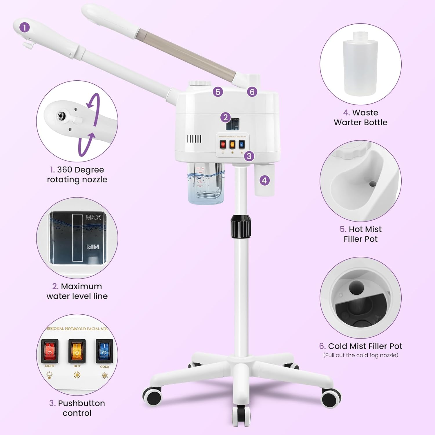 - 【Facial Steamer on Wheels】 Stand Facial Steamer with a pentagon-shaped load-bearing base,Good load bearing, smooth movement, Use of lightweight and high-strength materials.