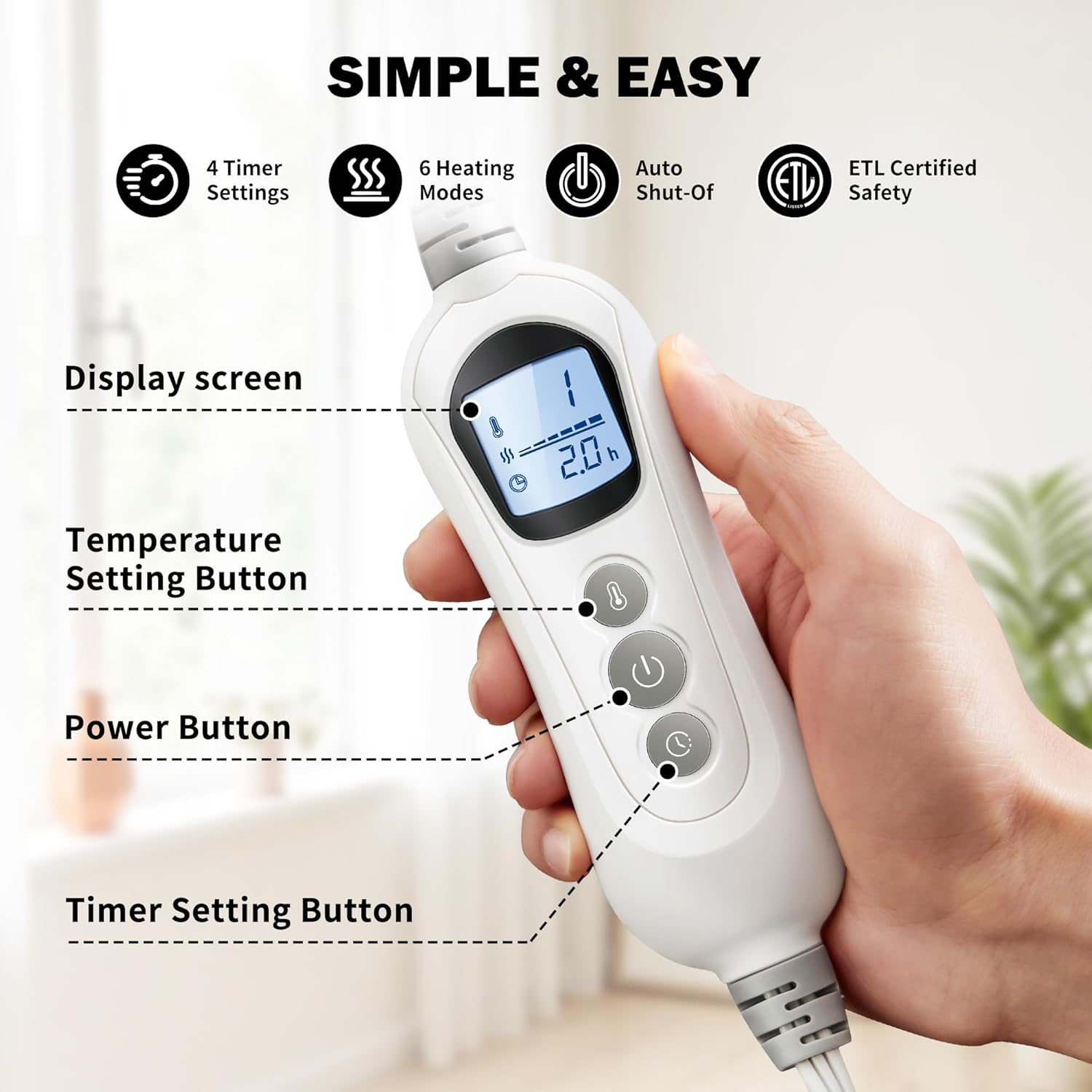 - Temperature Settings: The controller of heating pad features 6 Heat Settings(104°F~140°F)