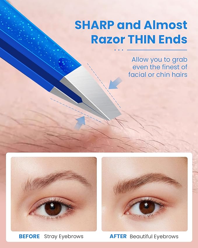 - 【Sharp SLANT TIPS for Every Hair】25° slanted tip is the perfect angle for removing unwanted hair. These ultra-fine tips grip the tiniest hairs effortlessly - from peach fuzz to stubborn chin hairs. Unlike flimsy tweezers, our professional-grade design removes hairs cleanly without breakage. Perfect for women's facial hair care routines and men's grooming kits alike.