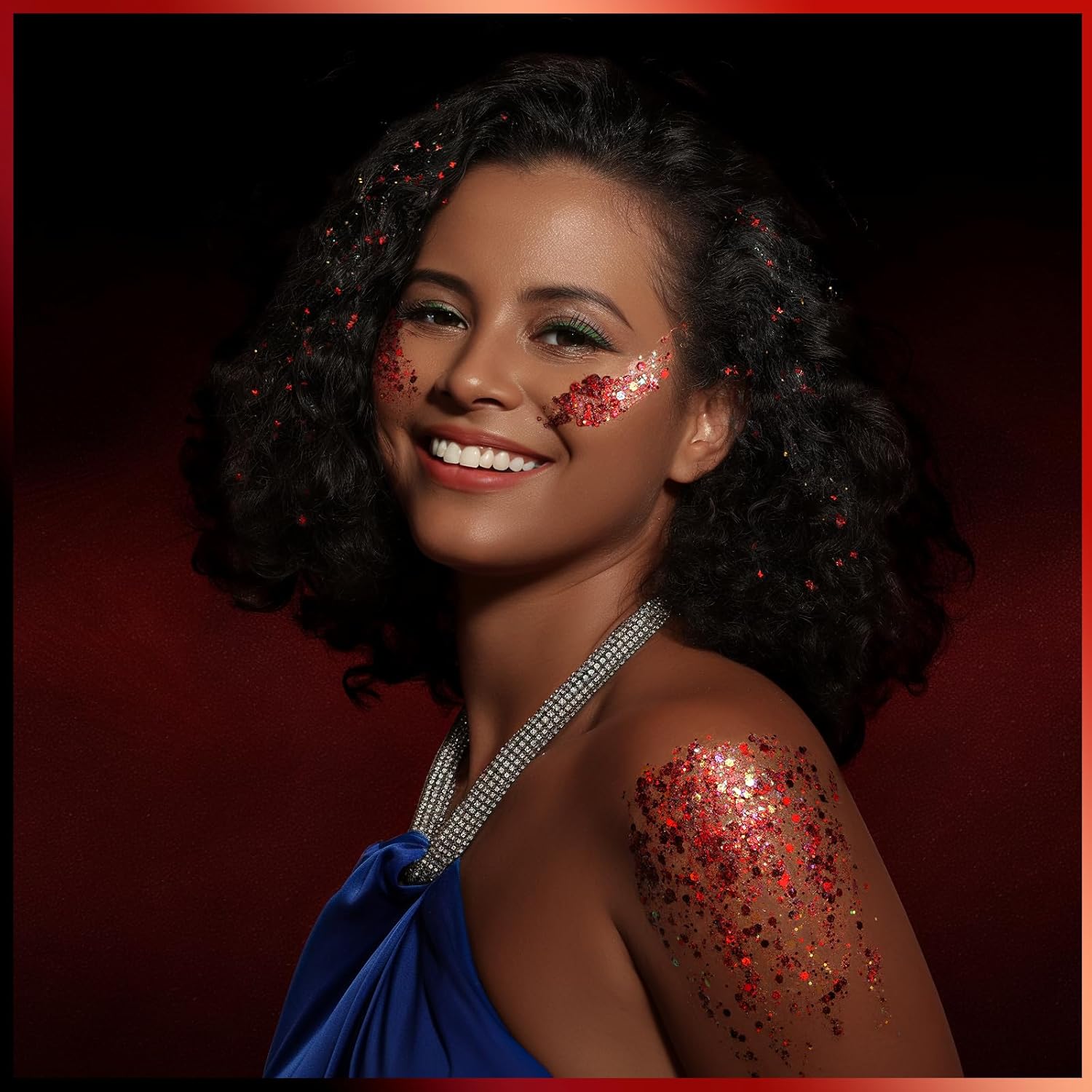 Teenitor Face Glitter, Red Body Glitter Gel, Hair Glitter, 6 Shapes Festival Rave Body Makeup Glitters Gel, Chunky Sparkling Glitter for Face, Body and Hair