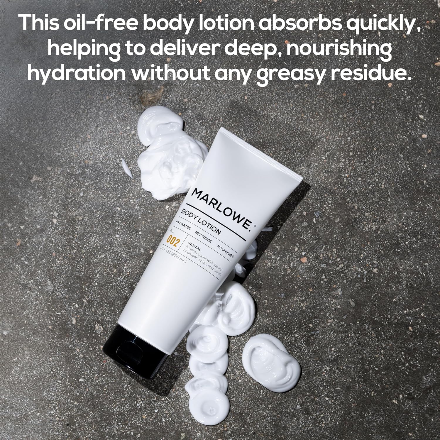 - Experience MARLOWE.: Our men's body lotion is crafted with a unique combination of natural ingredients like moisturizing Aloe Vera extracts and amino acids. For softer skin, apply the lotion generously onto hands & body twice a day
