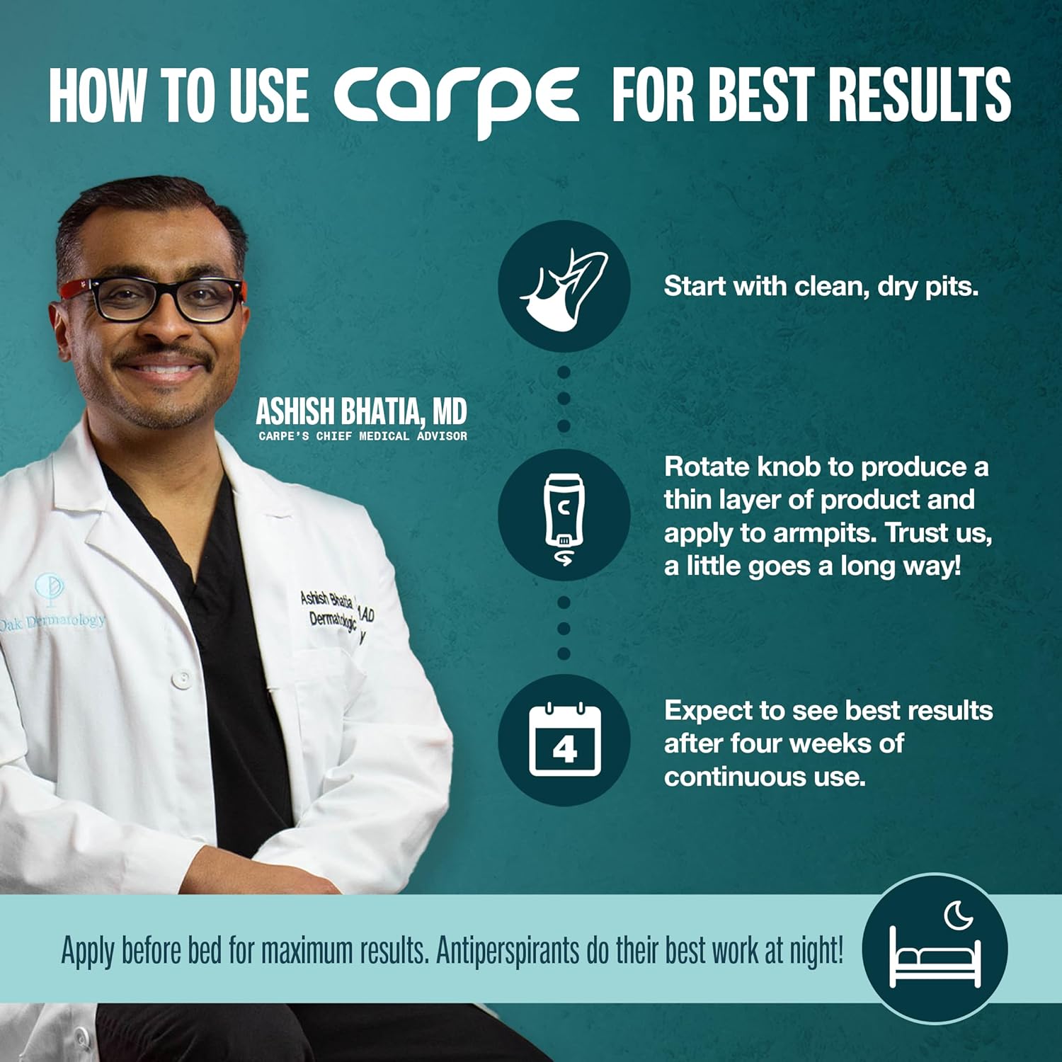 - EASY TO USE ANTIPERSPIRANT DEODORANT: With a thin layer of Carpe Antiperspirant Lotion you can reduce sweat with safe and effective ingredients. Apply our sweat control deodorant before bed for best results and say goodbye to your armpit sweat & smelly underarms without the downsides of prescriptions or procedures.