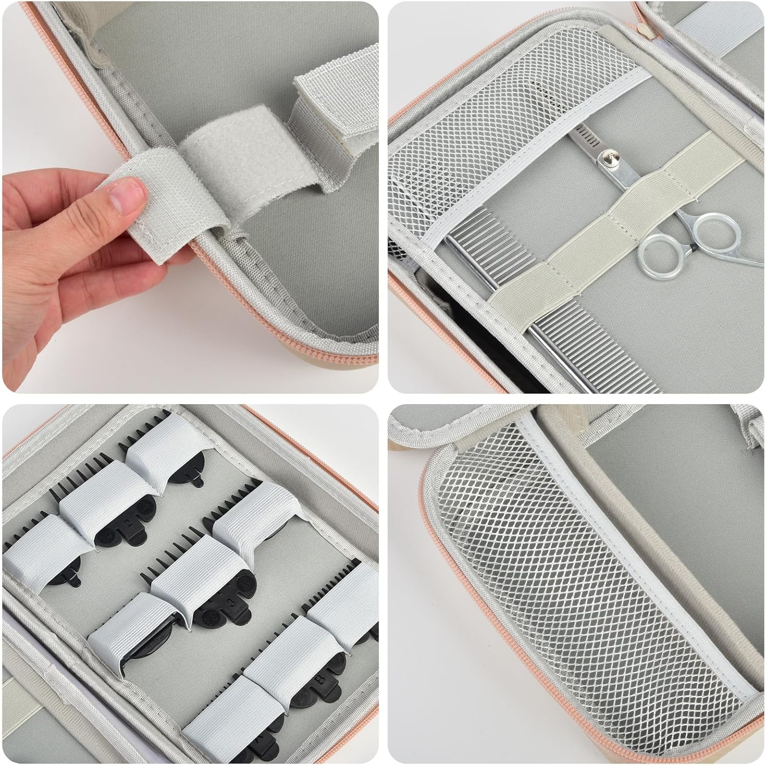 - Large Capacity Hair Shears Storage: Barber clippers storage bag with top cover is ingeniously designed to accommodate 9 limit combs of varying sizes, catering to diverse hair-cutting requirements. Ample base is capable of holding four clippers, bottom with a mesh pocket and partition system that efficiently separates tools and accessories, maintaining an organized interior. Adjustable Velcro straps allow for secure placement of shavers of different sizes, ensuring a snug fit for every tool.