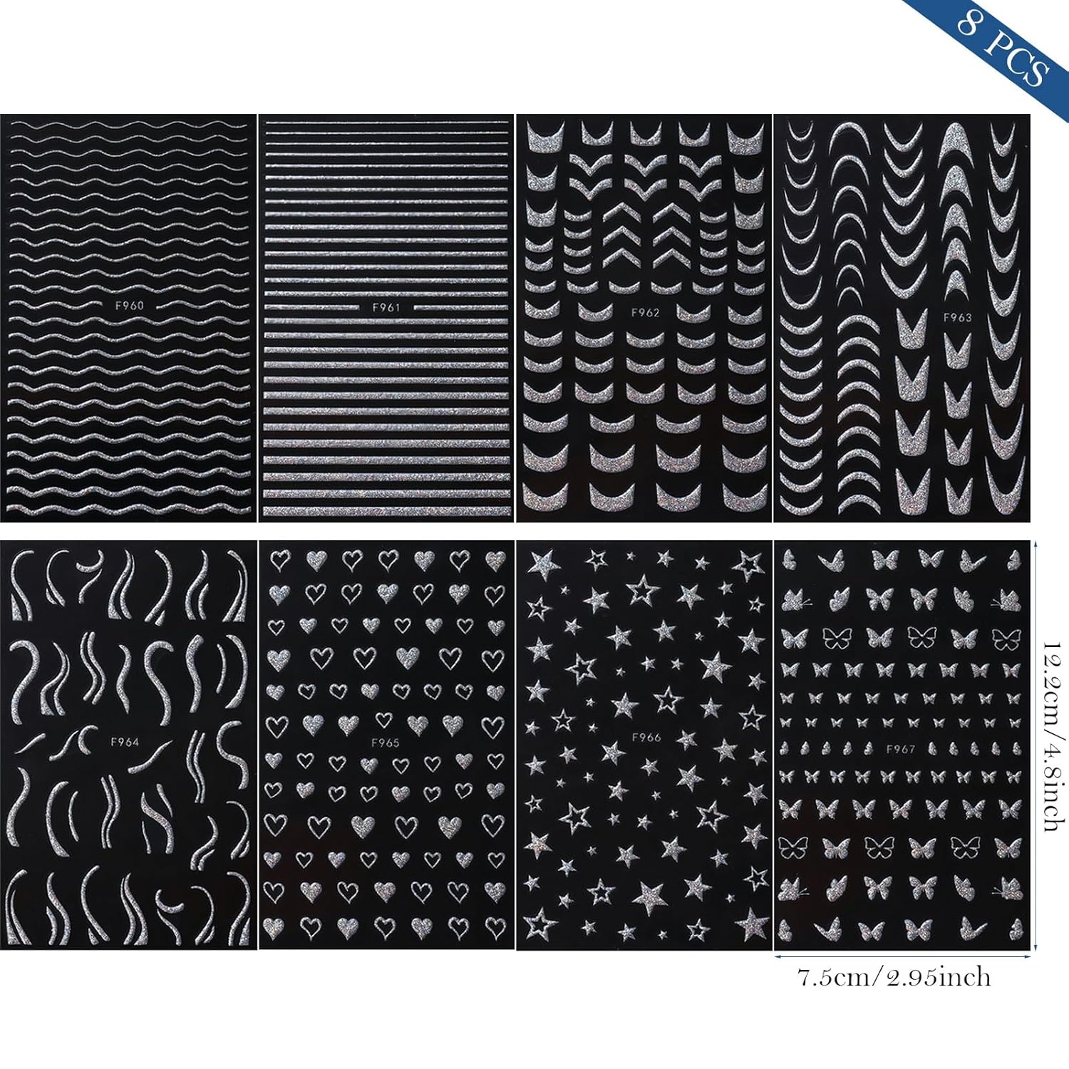 - French Tip Nail Art Stickers: Each sheet measures 4.8 x 2.95 inches, featuring a wide variety of French lines, stars, hearts, and butterfly designs to fit diverse nail art needs