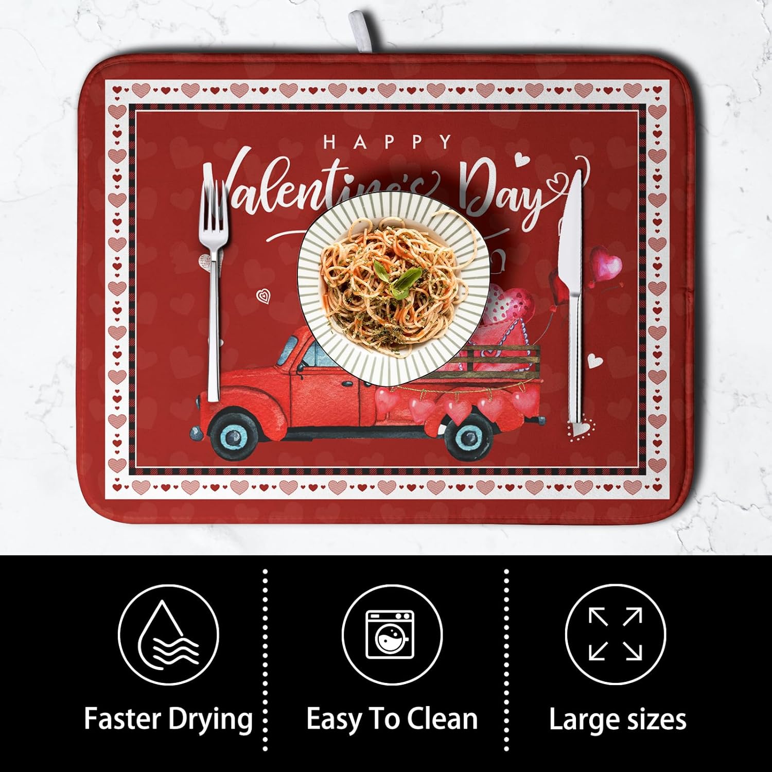 - Multifunctional Pad: Beautiful print on surface side, and reverses to a solid color. The Valentine's Day truck dishes drying mat absorbs water well, great for air drying dishes, glasses, bottles, silverware, fruits and vegetables, adds stability when drying fragile items