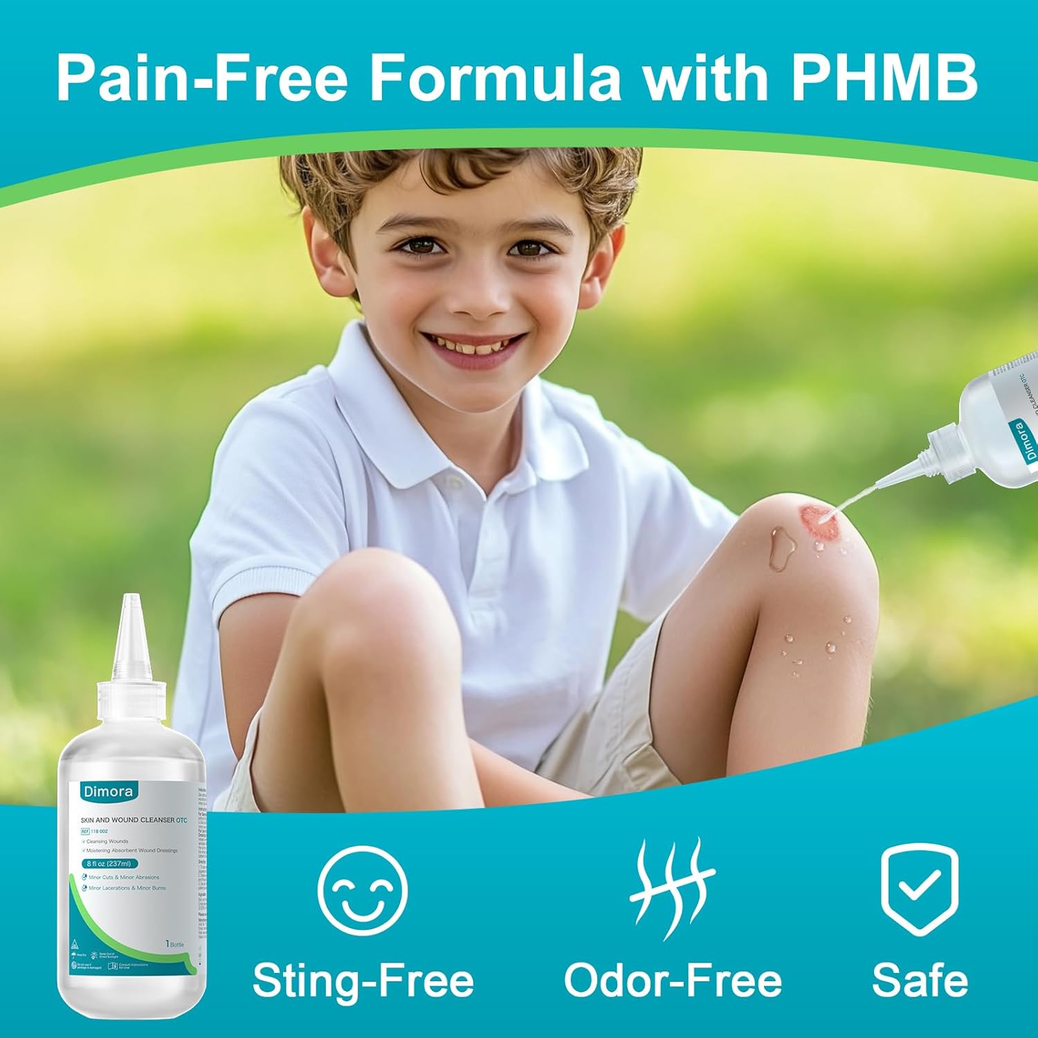 Dimora Skin and Wound Cleanser, OTC First Aid Antiseptic Cleanser,Moistening Absorbent Antibacterial Wound Dressings for Cuts, Abrasions, Lacerations, Burns, Skin Cleansing and Rinsing -8oz / 237mL