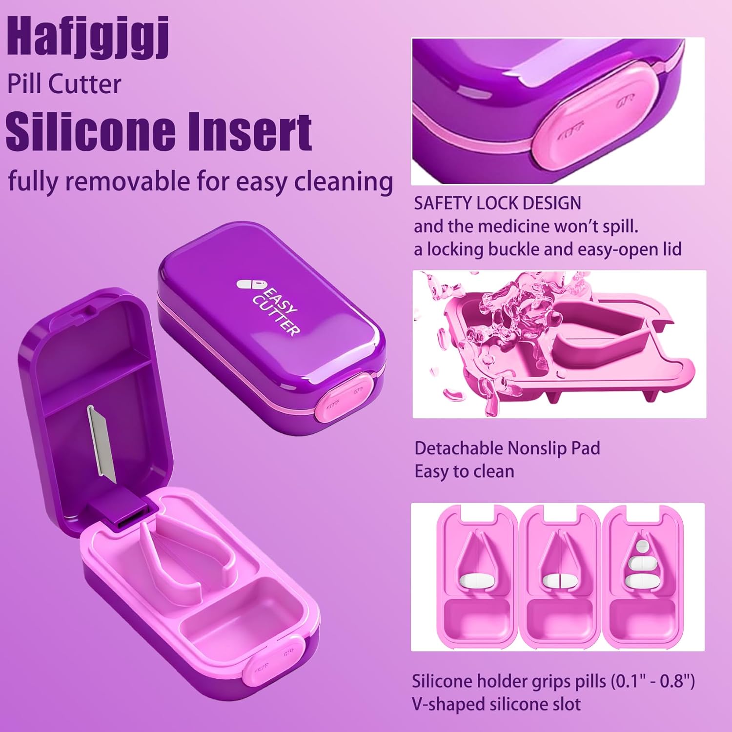 - Silicone Insert: The non-slip lining of the pill splitter provides secure pill placement and is fully removable for easy cleaning