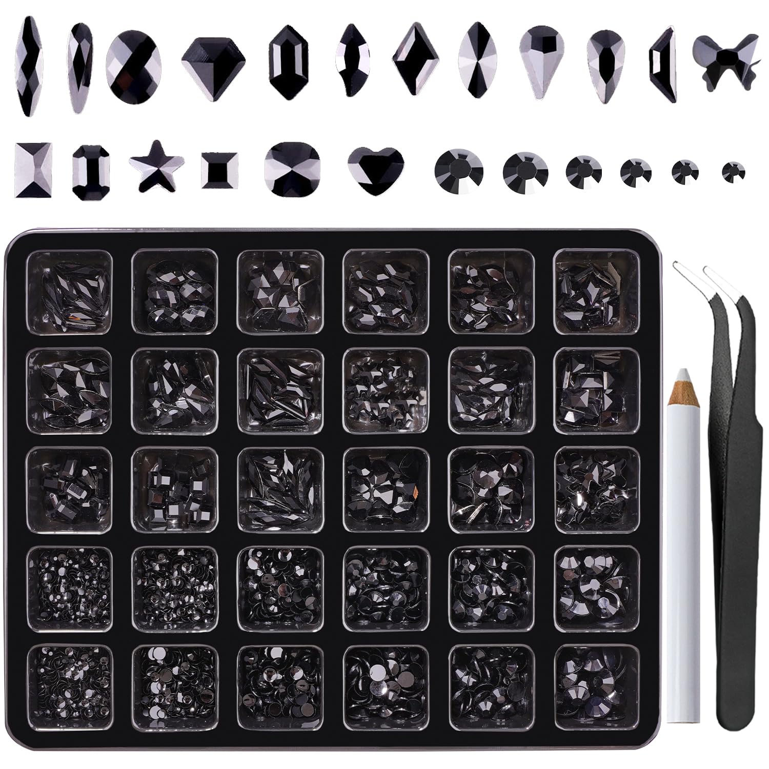 - Create Your Wonderful DIY Design - 18 different stylish shape nail jewels and 2720 black rhinestones. Each size or shape nail art rhinestones have separate compartment, which is very useful for your classification and prevents mixing. Just enjoy your rhinestones for crafting.