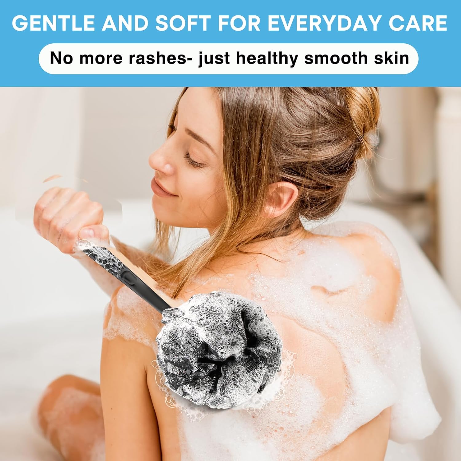 - INFUSED WITH BAMBOO CHARCOAL: Our long-handled sponge for shower or shower back scrubber is designed to deeply cleanse and refresh your skin. The bamboo charcoal infusion on our bath sponge with handle or back cleaner for shower effectively removes excess dirt and impurities, helping to reduce body odor while promoting a smoother skin. Ideal for reaching hard-to-clean areas, our back brush for shower for women or back scrubber for shower for women ensures an enjoyable bathing experience.