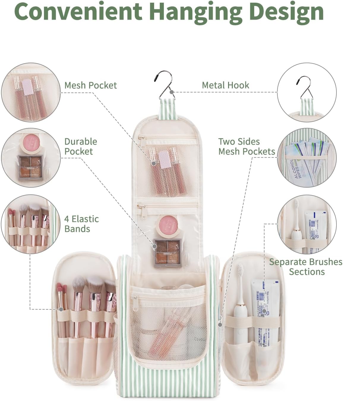 Narwey Small Striped Hanging Travel Toiletry Bag for Women, Travel Bag for Toiletries, Makeup Bag Organizer Cosmetic Bags Make Up Bags for Women (Mint Green Stripe)