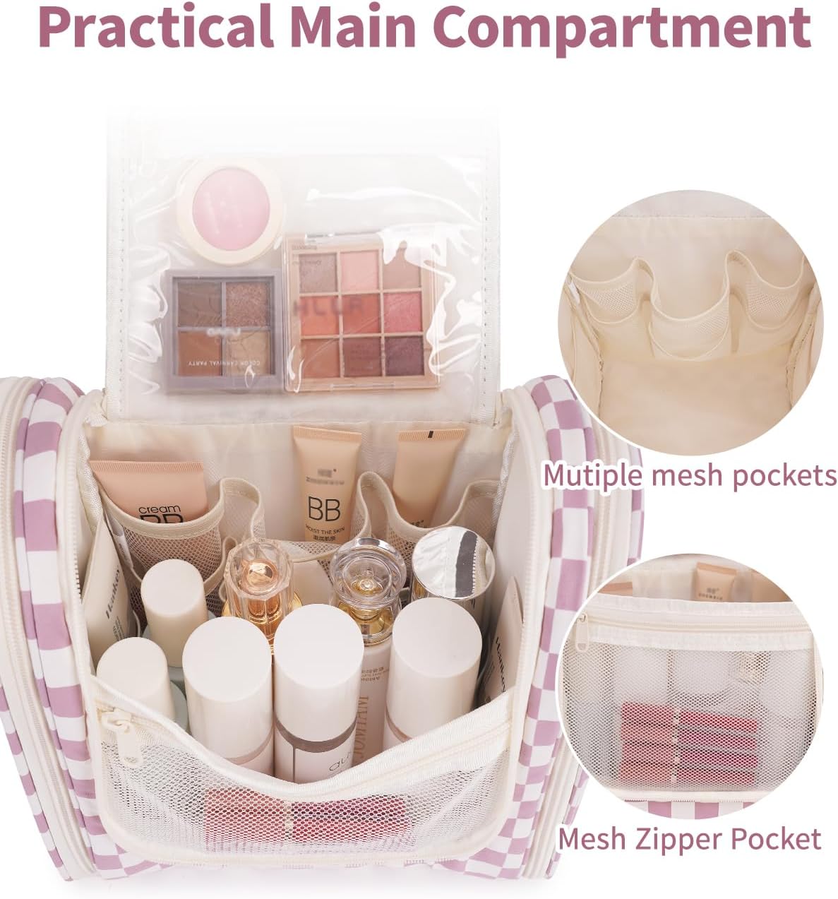 Narwey Checked Hanging Travel Toiletry Bag for Women, Travel Bag for Toiletries, Makeup Bag Organizer Cosmetic Bags Make Up Bags for Women (Dusty Rose Checkerboard)