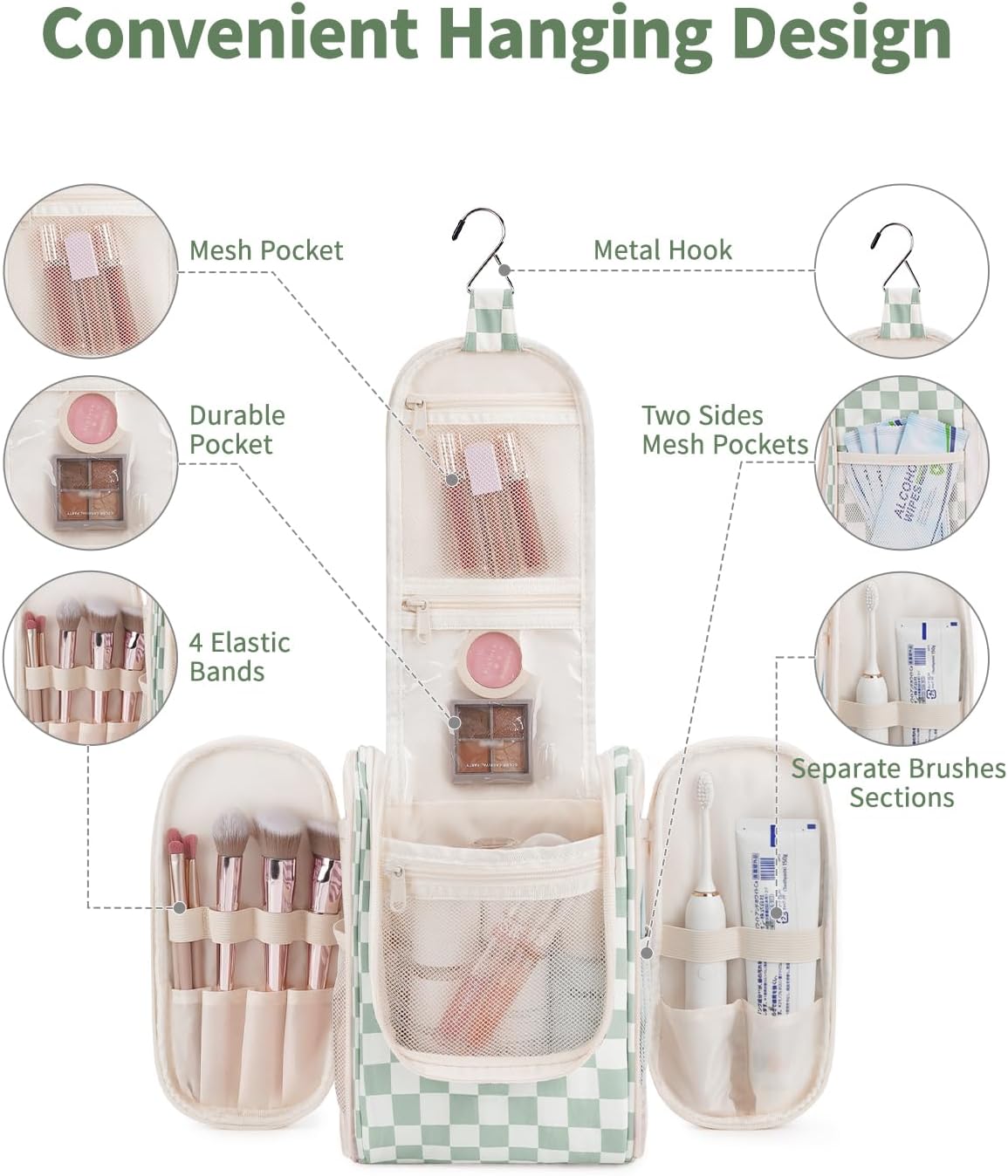Narwey Small Checkered Hanging Travel Toiletry Bag for Women, Travel Bag for Toiletries, Makeup Bag Organizer Cosmetic Bags Make Up Bags for Women (Mint Green Checkerboard)